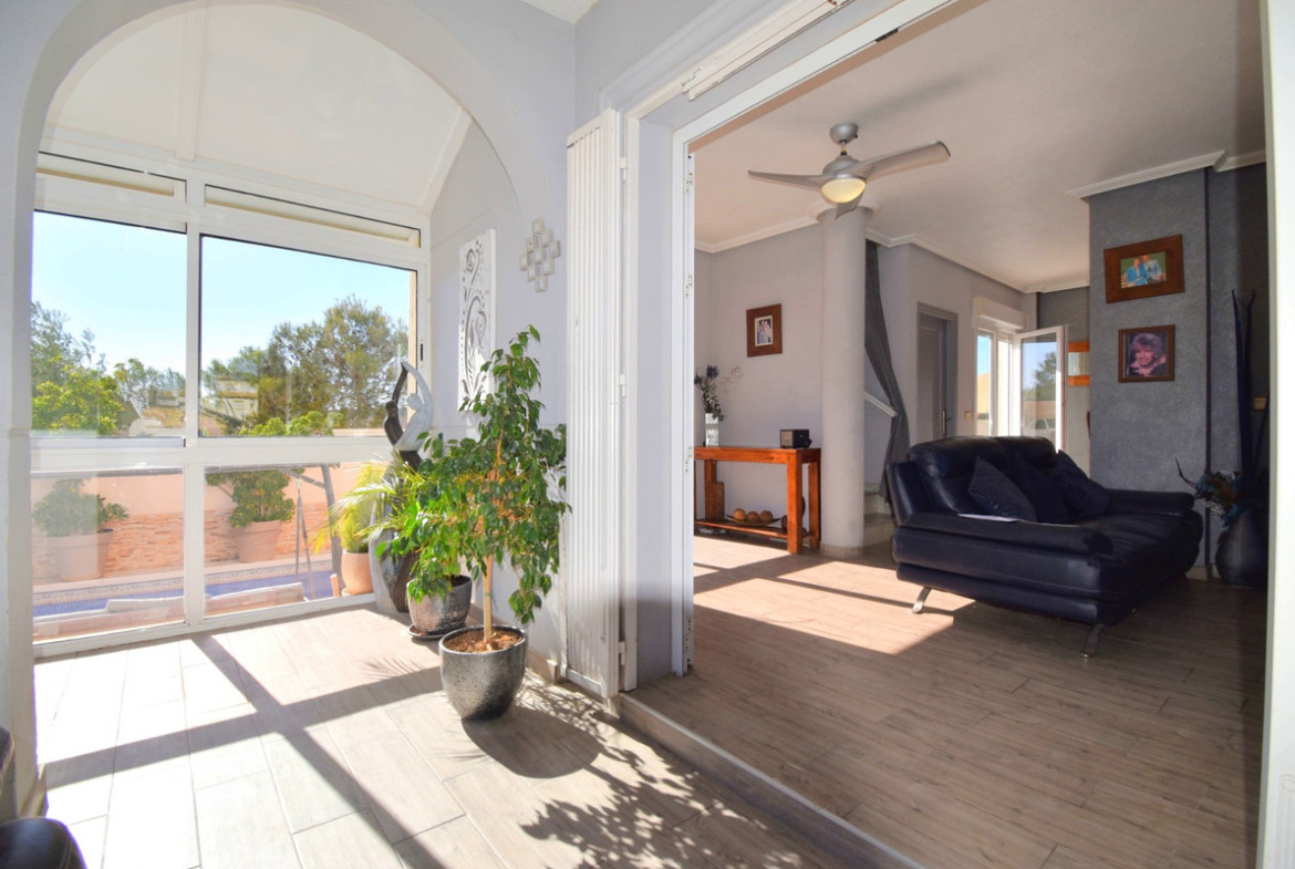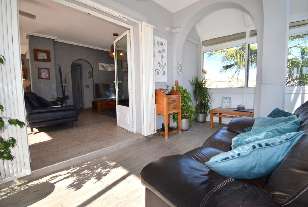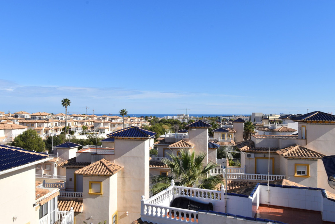 This South Facing, Four Bedroom Detached Villa in Playa Flamenca is located in the coveted area of Orihuela Costa, offering an enviable combination of coastal charm and modern convenience. Set upon a spacious 255m2 plot, this property boasts a generous 103m2 build size, providing ample space for comfortable living. Featuring four bedrooms and three bathrooms, this villa is ideal for families or those who enjoy hosting guests. The separate kitchen offers a practical layout for culinary endeavors, while fitted wardrobes ensure convenient storage solutions throughout the home. Convenience is paramount with this property, as it is just a 5-minute walk from the bustling shops and entertainment of La Zenia Boulevard. Additionally, the serene seafront is a mere 5-minute drive away, offering residents easy access to the sun, sand, and sea. Enjoy captivating communal views and refreshing sea vistas from various vantage points within the villa, enhancing the overall ambiance of coastal living. Air conditioning throughout ensures comfort even during the warmest days, while an electric fireplace adds warmth and charm on cooler evenings. Outdoors, the villa boasts a private pool, perfect for enjoying a refreshing swim or basking in the Mediterranean sunshine. A windowed covered terrace provides an ideal spot for al fresco dining or simply unwinding while admiring the garden views. For panoramic vistas, a solarium offers sweeping outlooks of the surrounding landscape and sea. With its prime location, modern amenities, and stunning views, this villa presents an exceptional opportunity to embrace the quintessential Mediterranean lifestyle in Playa Flamenca.