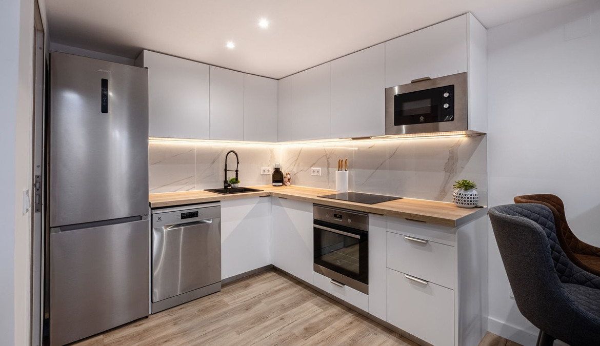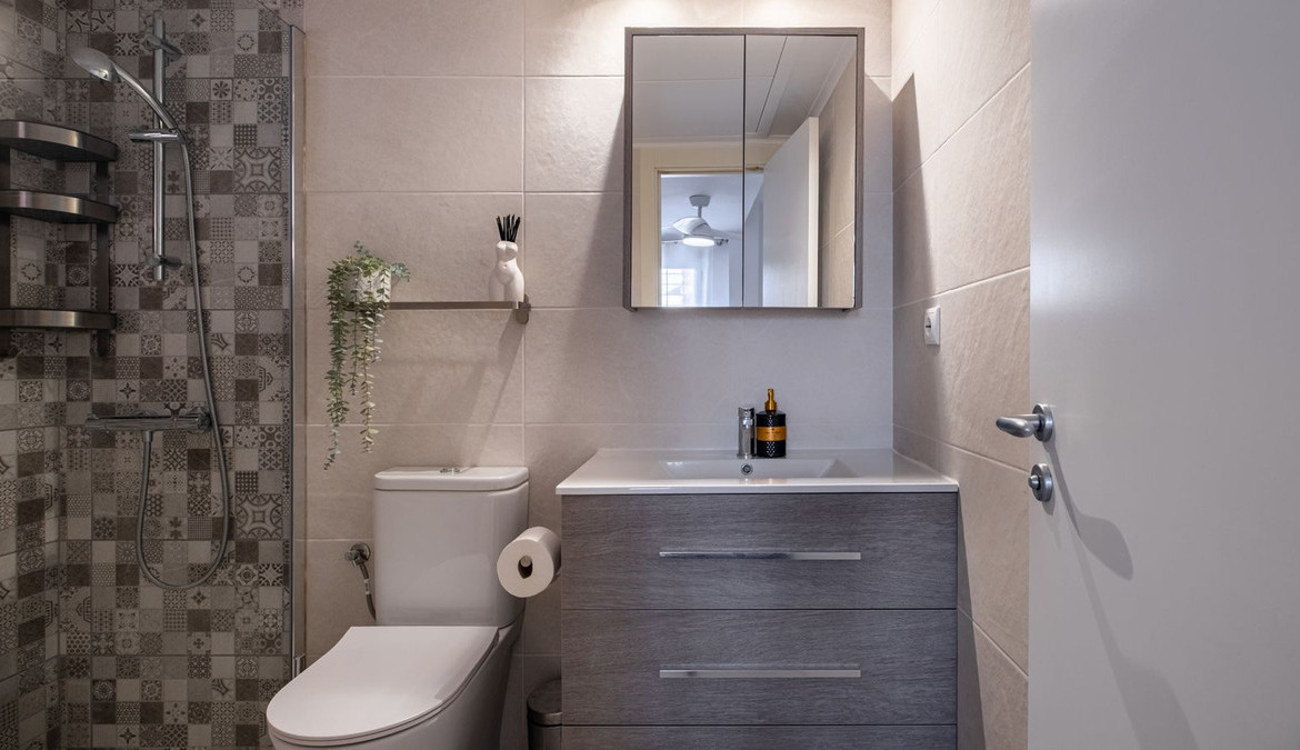 Stylish renovated ground-floor apartment with a well-planned layout and high quality finishes. Bright open plan kitchen and living area equipped with new appliances, dishwasher, and washing machine. Three spacious bedrooms and two modern bathrooms, one of which is en-suite to the master bedroom. Separate laundry room. Private parking right by the entrance and two locked storage units next to the apartment provide both convenience and extra storage.