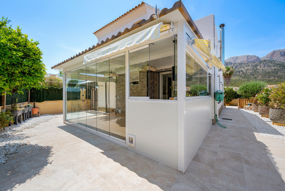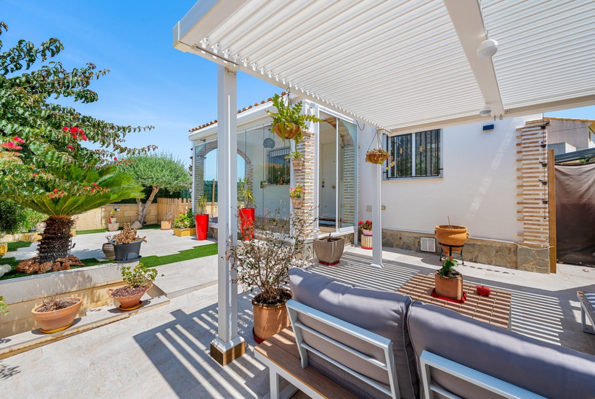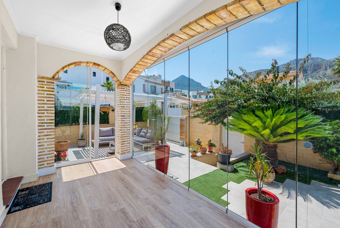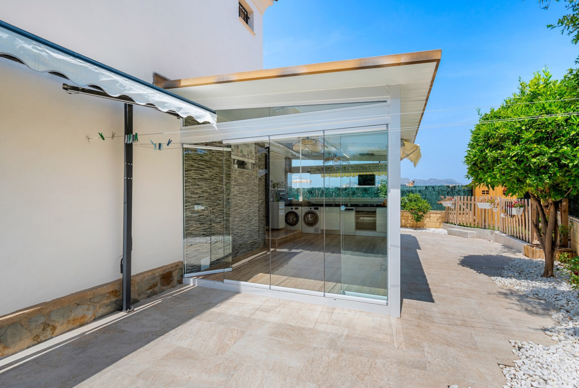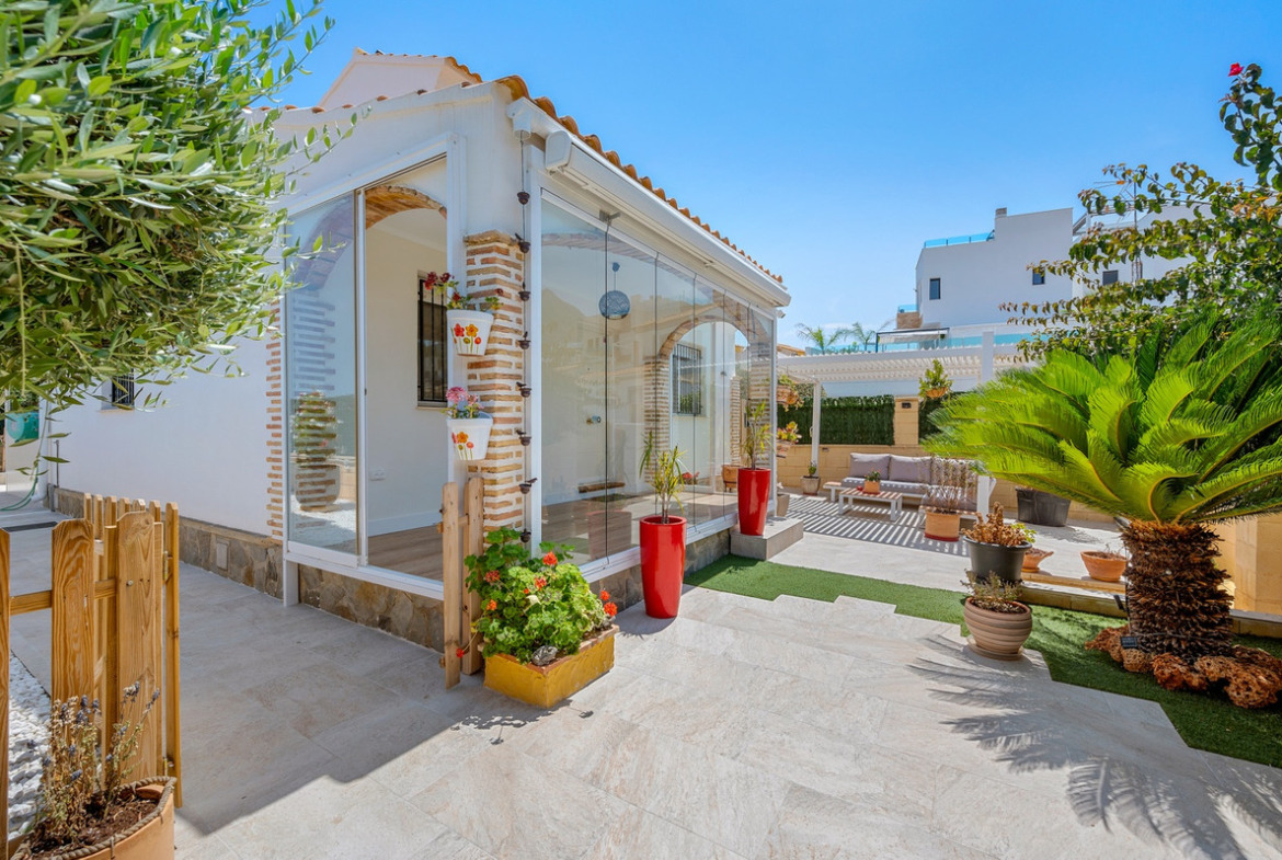 Outdoor areaThe villa has a charing garden with a glazed terrace in front. In the front garden you can also find a covered parking space, which is currently being used as a seating area. On the side of the house you can find a storage room. There is another glazed terrace in the back garden, and in this part of the garden you can also find an outdoor shower and space for another seating area. In the first floor there is a terrace with sea views.