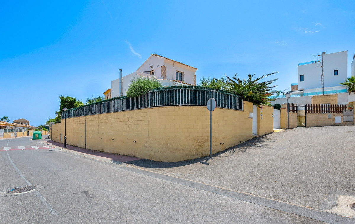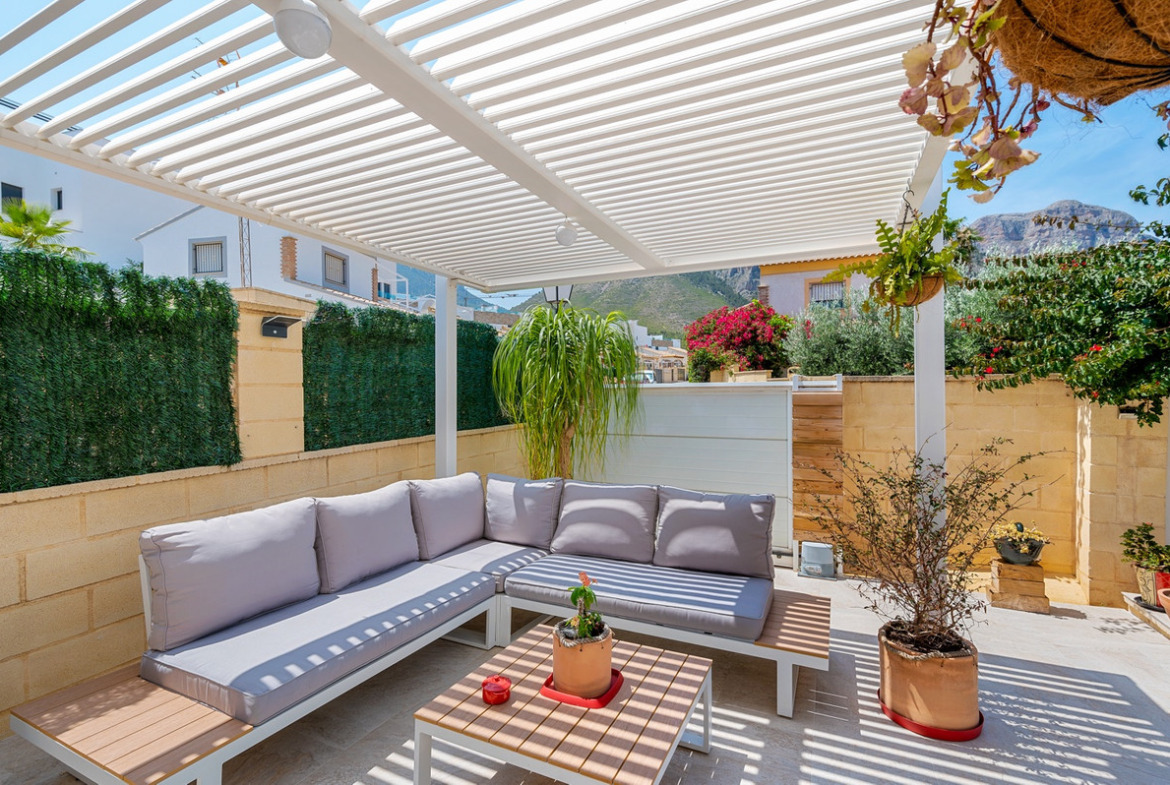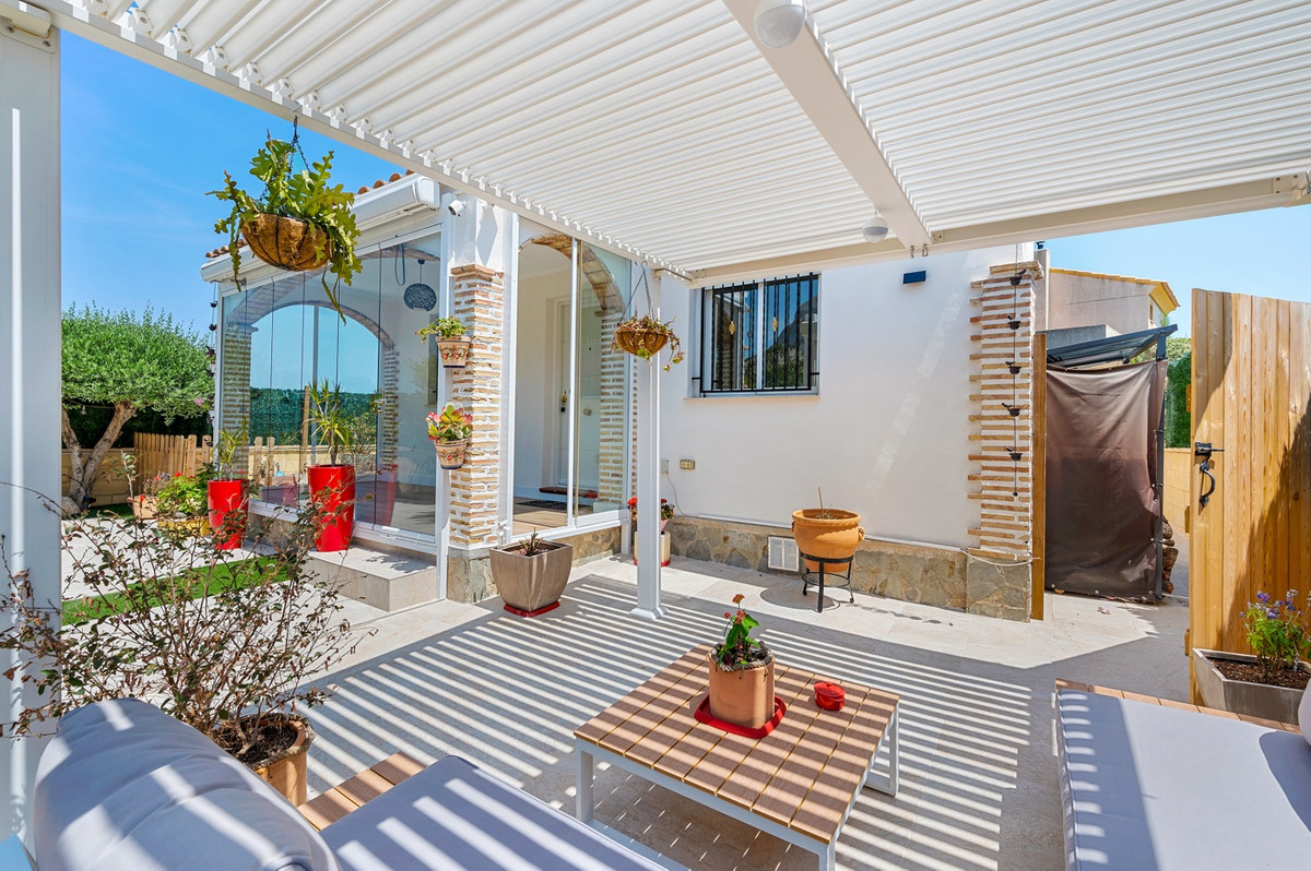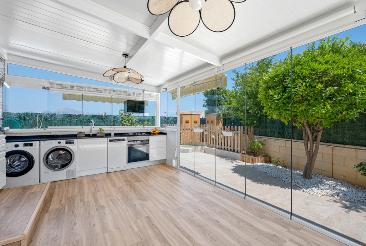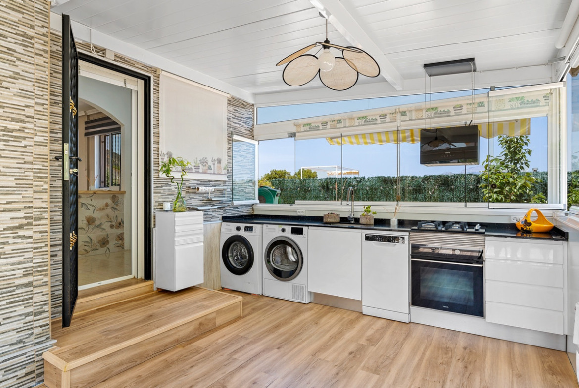 Outdoor areaThe villa has a charing garden with a glazed terrace in front. In the front garden you can also find a covered parking space, which is currently being used as a seating area. On the side of the house you can find a storage room. There is another glazed terrace in the back garden, and in this part of the garden you can also find an outdoor shower and space for another seating area. In the first floor there is a terrace with sea views.