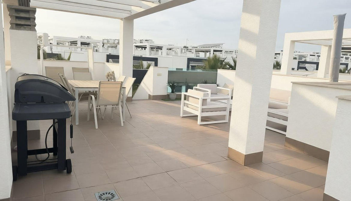 Exclusive furnished penthouse in the prestigious Oasis Beach 7 residence, Torrevieja. A modern 66 m2 property designed for comfort, ideal as a high-yield investment or holiday home.. . Layout: 2 bedrooms (one en-suite), 2 full bathrooms, and a bright living room with an open-plan kitchen.. . Outdoor Spaces: Terrace overlooking the pool and a spectacular 58 m2 private solarium.. . Features: Sold fully furnished and equipped (appliances, AC, motorized shutters, and LED lighting). Includes underground parking.. . Luxury Complex: Gated community with extensive green areas and a resort-style pool.. . Location: Just 1,500 m from the beach and 5 minutes from Zenia Boulevard. Ready to move in!