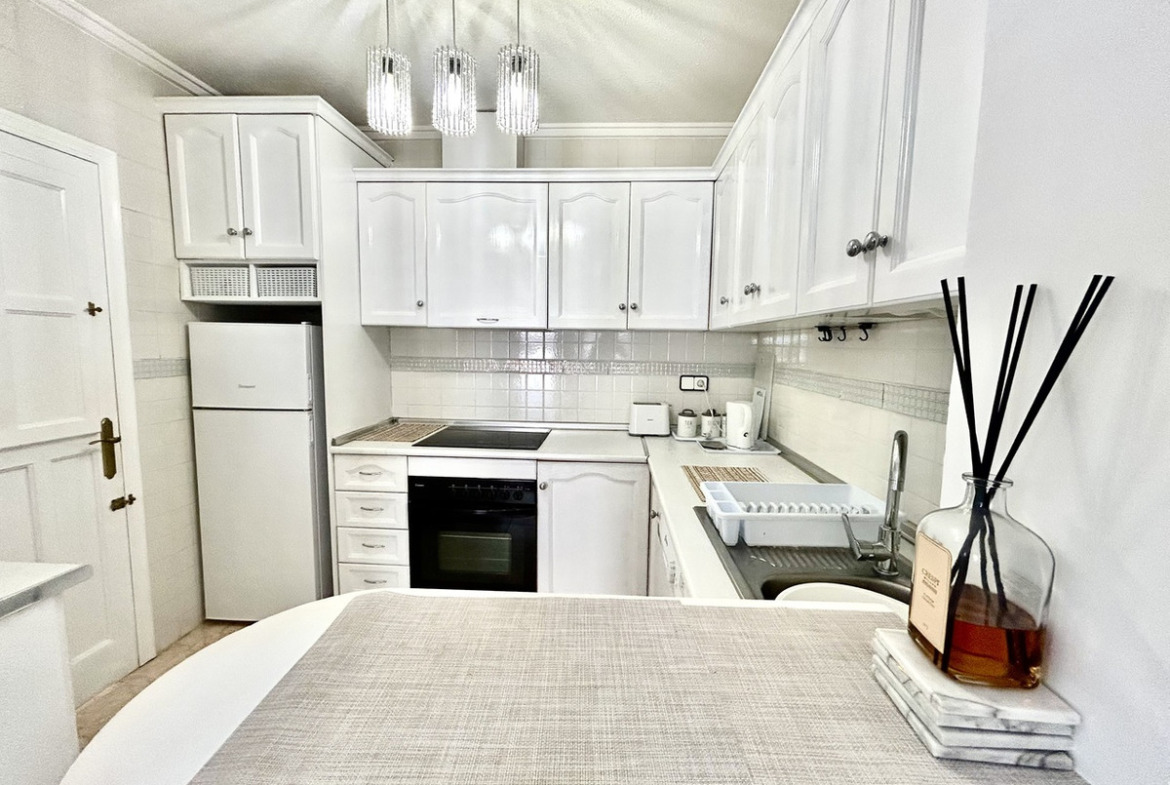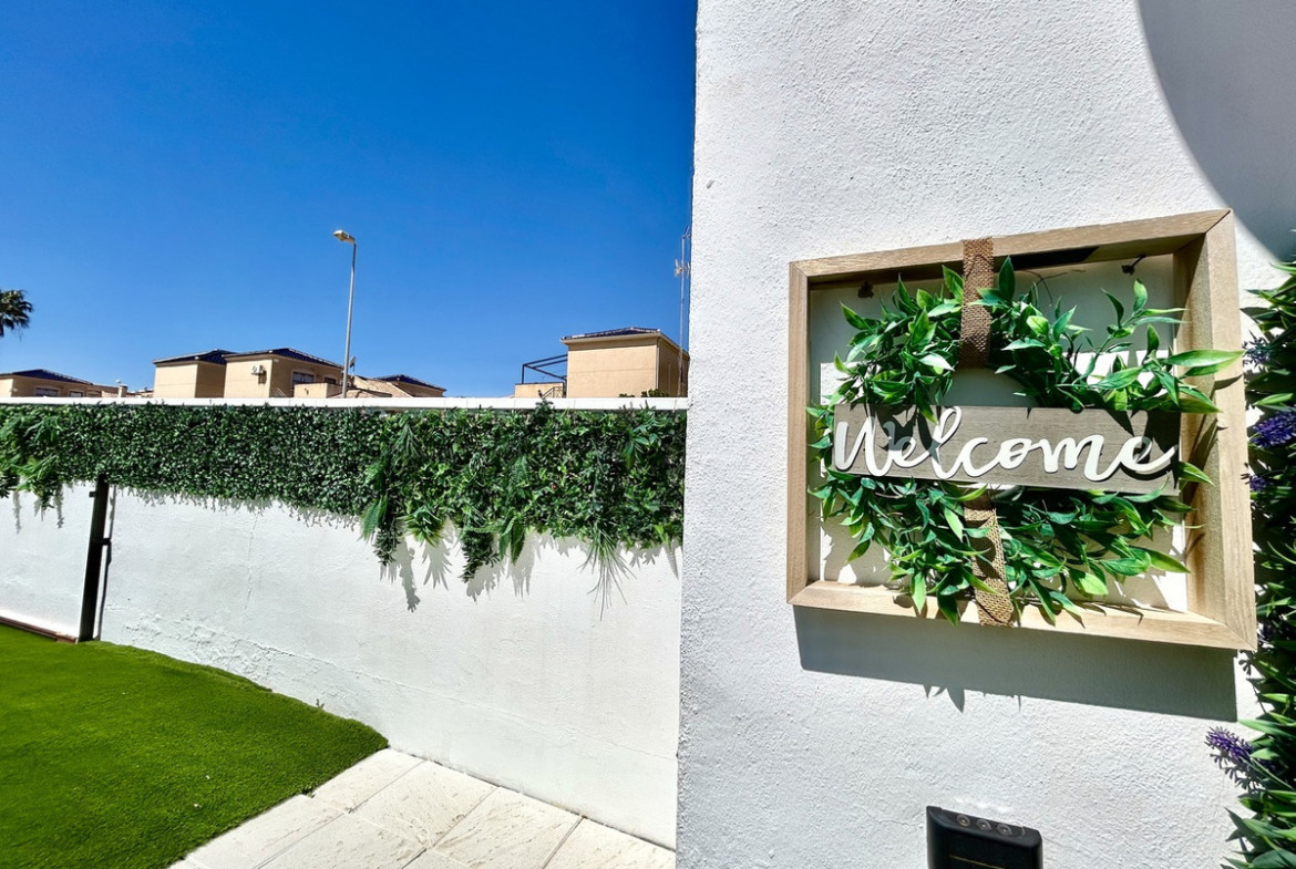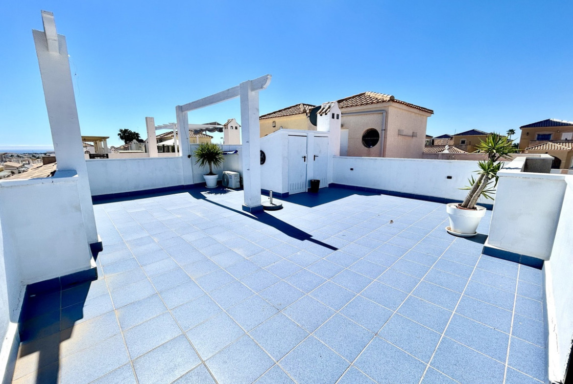 Immaculate and very well presented bungalow style property for sale with sea views. Situated on a corner plot with a fantastic amount of private, outdoor space. Inside, the property offers 2 bedrooms, 1 bathroom, a slick American style kitchen, spacious living and dining areas which lead out to the glazed in terrace. The property has a private roof solarium which is accessed via an external staircase and boasts the sun all day long, here you have wonderful views towards the Mediterranean sea! The property has been tastefully renovated throughout and is sold fully furnished with air-conditioning. The property forms part of the well kept community 'Serena V' which shares a communal pool and bathing areas and is just a few minutes walk from the nearest supermarket, restaurants, bars and convenience stores.