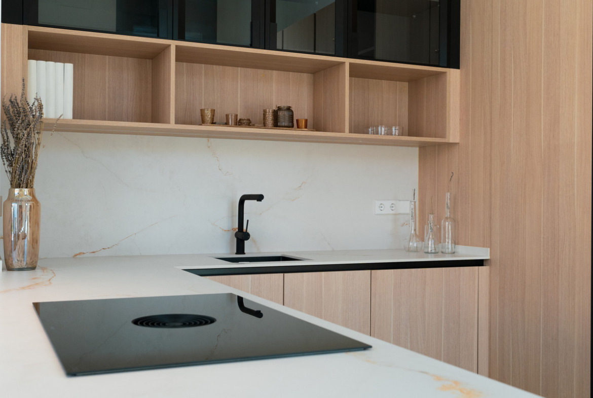 Moving up to the upper floor, which totals 115 square meters, you will find two additional bedrooms, maintaining the modern and elegant style of the home. These bedrooms also have two fully equipped bathrooms, offering comfort and privacy. The modern and fully equipped kitchen stands out for its functional and aesthetic design, ideal for preparing meals with ease and style. Adjacent to the kitchen, the nearly 30-square-meter living-dining room presents a bright and welcoming space, perfect for family gatherings or moments of relaxation.