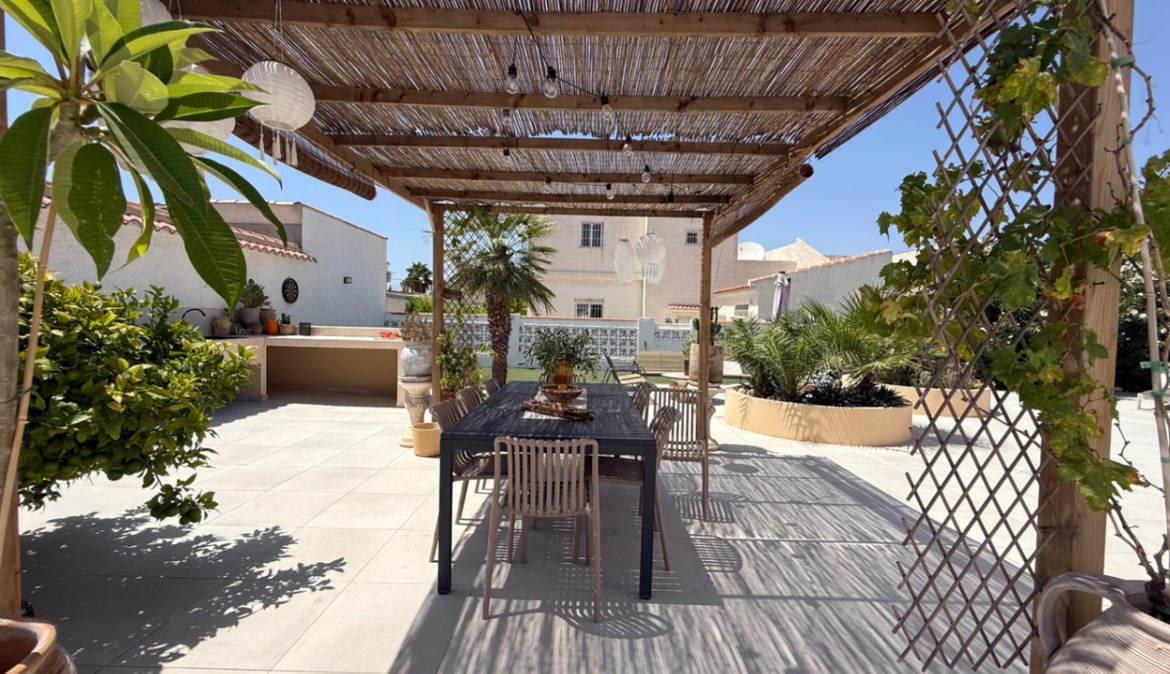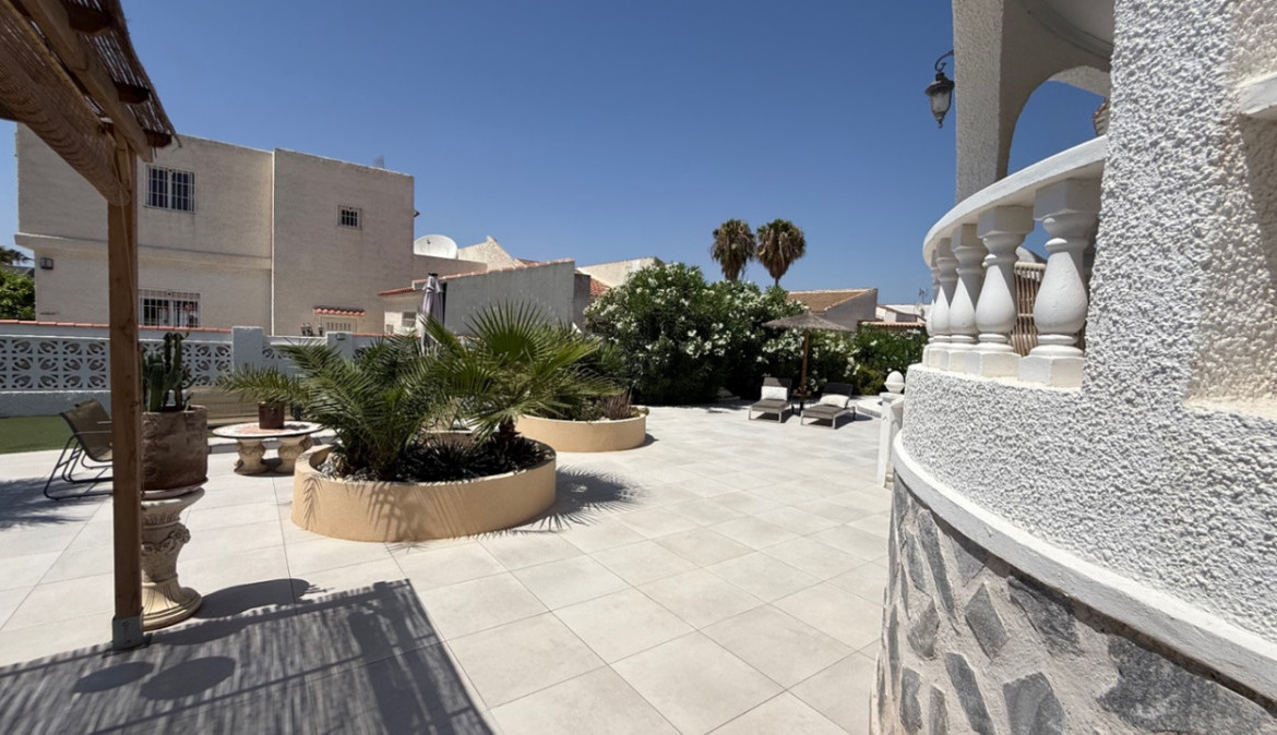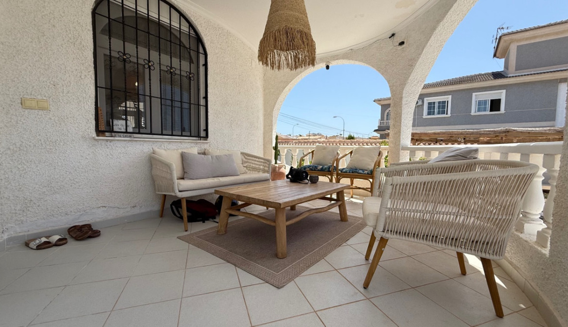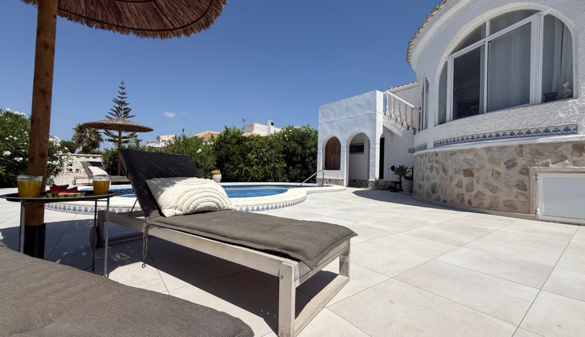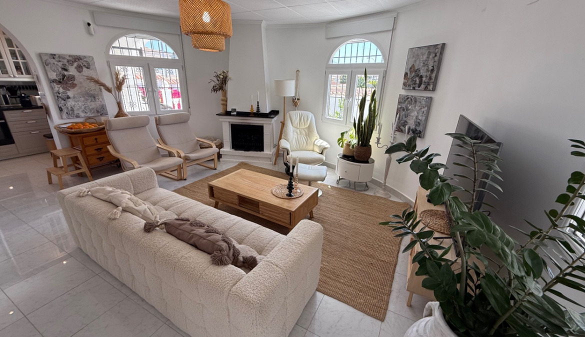 Introducing this beautifully presented three-bedroom, two-bathroom detached villa, ideally located in the highly sought-after neighborhood of El Chaparral / San Luis – Costa Blanca South. Set on a generous plot of approximately 800 m², this property offers a rare blend of privacy, space, and refined style. Surrounded by privacy walls and accessed via a secure entrance, the villa boasts a tranquil and inviting ambiance from the moment you arrive.