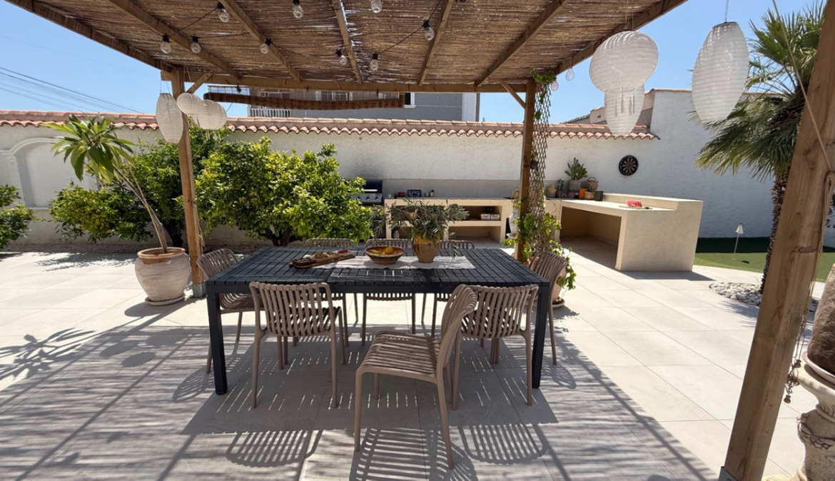 The home has been thoughtfully updated to a high standard, blending clean Nordic design with the warmth of traditional Spanish elements. The result is a harmonious and welcoming interior that feels both contemporary and timeless. The spacious, glass-enclosed veranda overlooks the stunning pool area with salt water pool and manicured, low-maintenance gardens, creating a seamless indoor-outdoor living experience that can be enjoyed year-round. The propeties gardens have a coveted southwest-facing orientation, bathed in natural sunlight throughout the day—perfect for sunseekers and al fresco entertaining. Various chill out zones, salt water pool, dining areas, solarium with view to the salt lake and outdoor kitchen really complete this outdoor oasis. The gardens are full of fruiting trees inc: orange, blood orange, mandarin, lemon, mango and olive.
