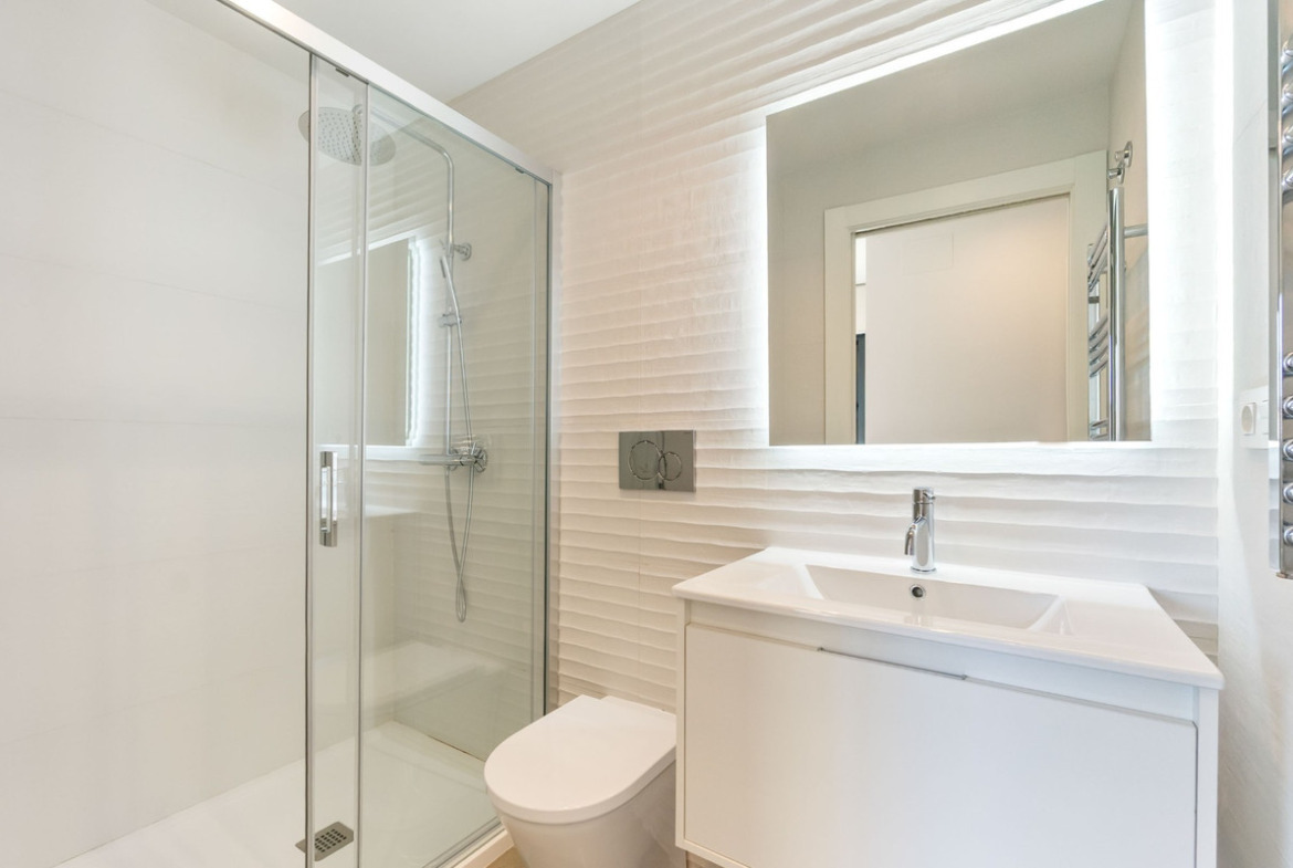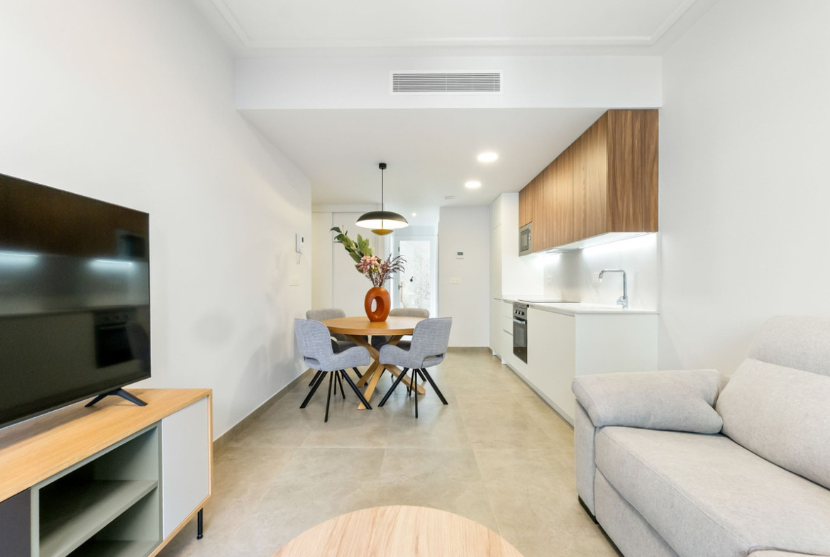This modern apartment offers a functional and bright design in a highly convenient area of Torrevieja. It features two bedrooms —including the main one— and two contemporary bathrooms with glass screens and floating sinks, one finished with textured white tiles and the other with a wood-effect style. It also includes central air conditioning (hot/cold) and north–south orientation for year-round comfort.