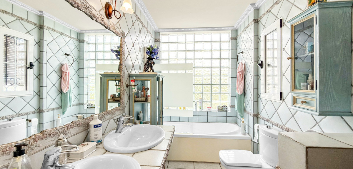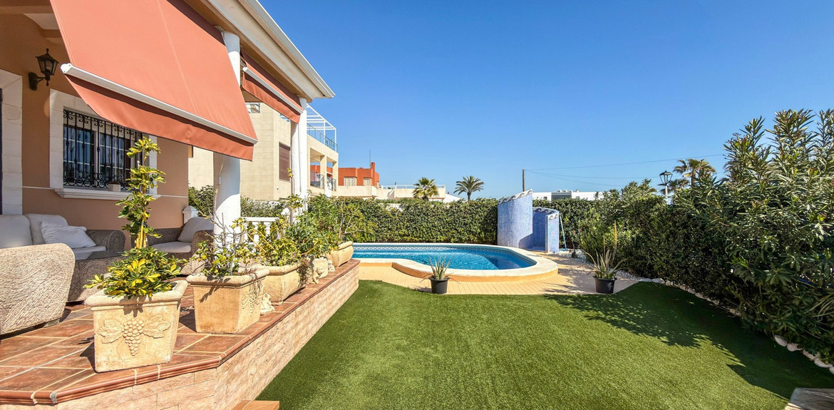 The outdoor areas truly elevate this property. A stunning private swimming pool is surrounded by a lush, landscaped garden, offering a peaceful and private retreat under the Mediterranean sun. A covered porch and pergola with a built-in barbecue create the perfect setting for unforgettable moments with family and friends.