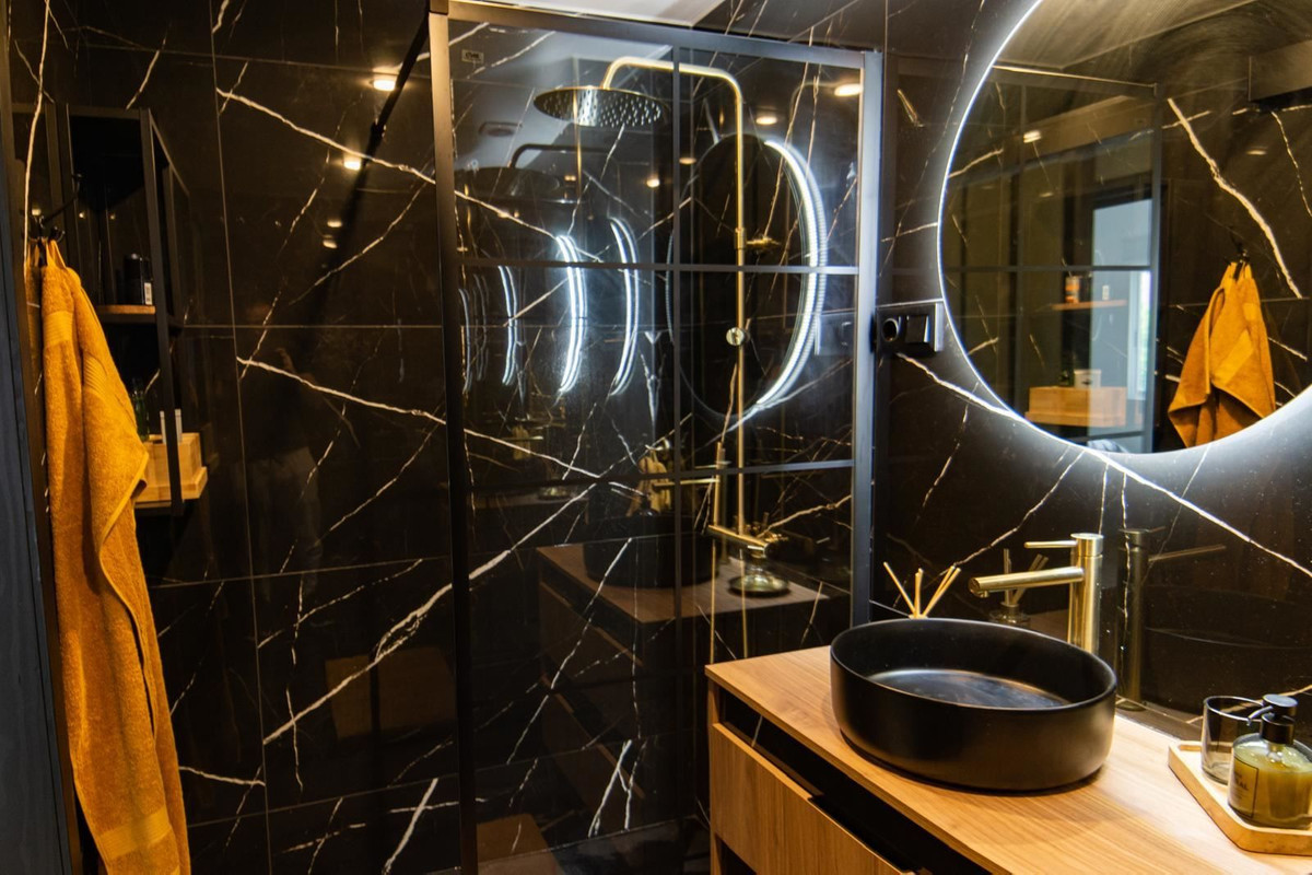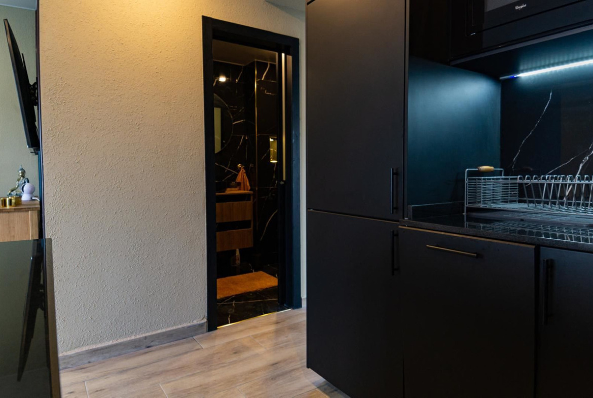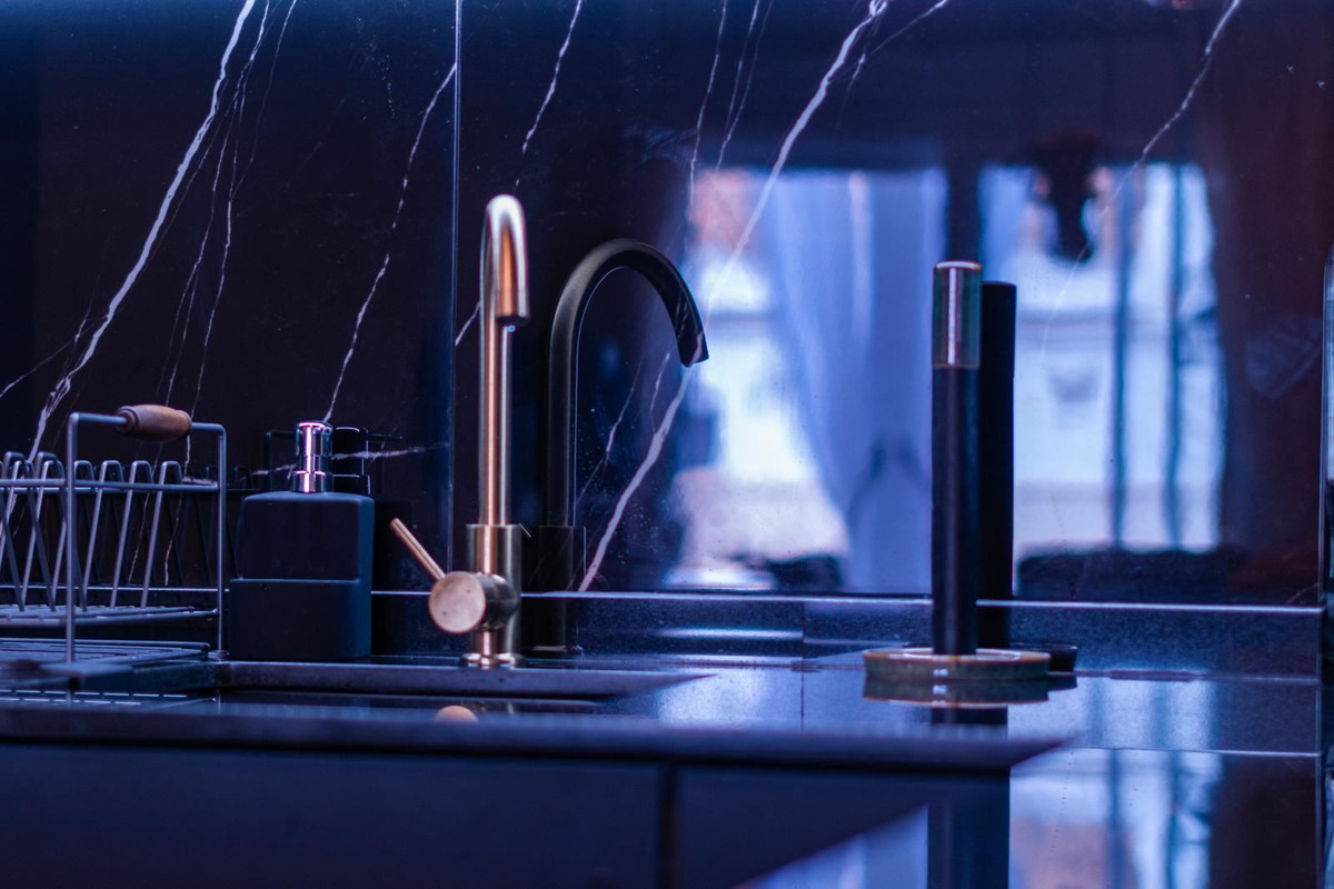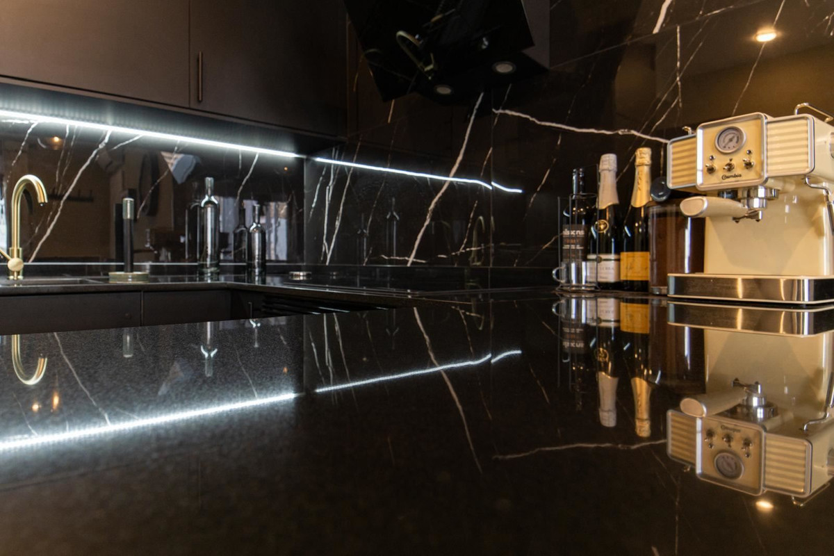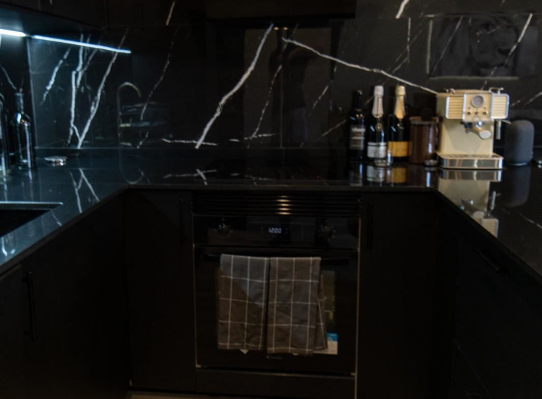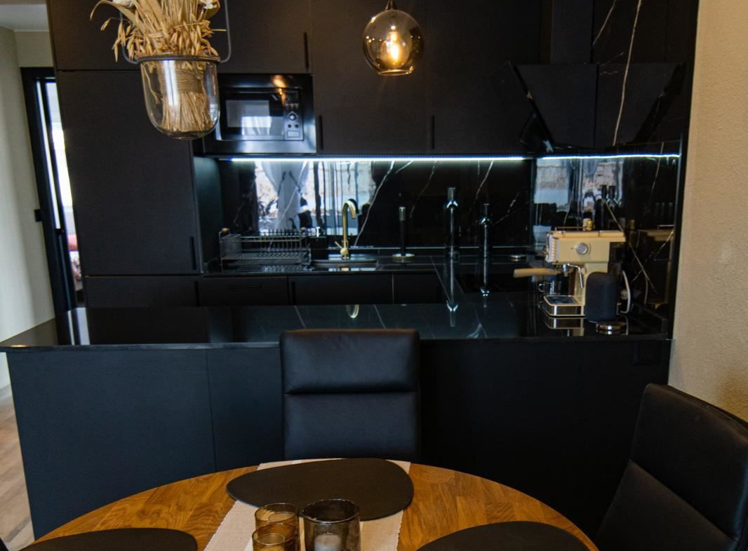 The stylish kitchen is a real highlight. With its elegant design in black marble, it creates an exclusive and modern feel that is perfect for both everyday life and social moments. All appliances and details are well thought out to make the kitchen both beautiful and functional.