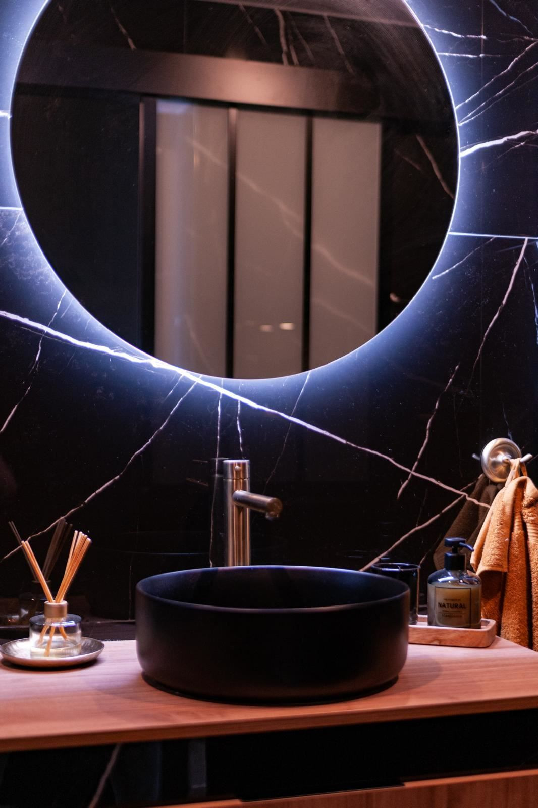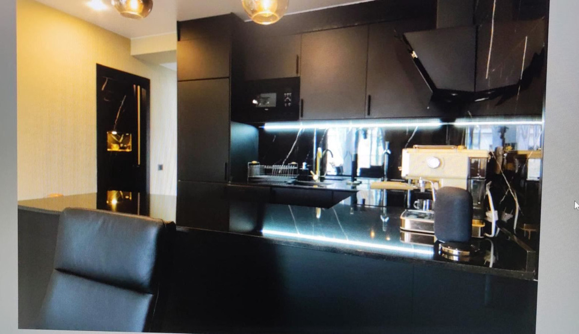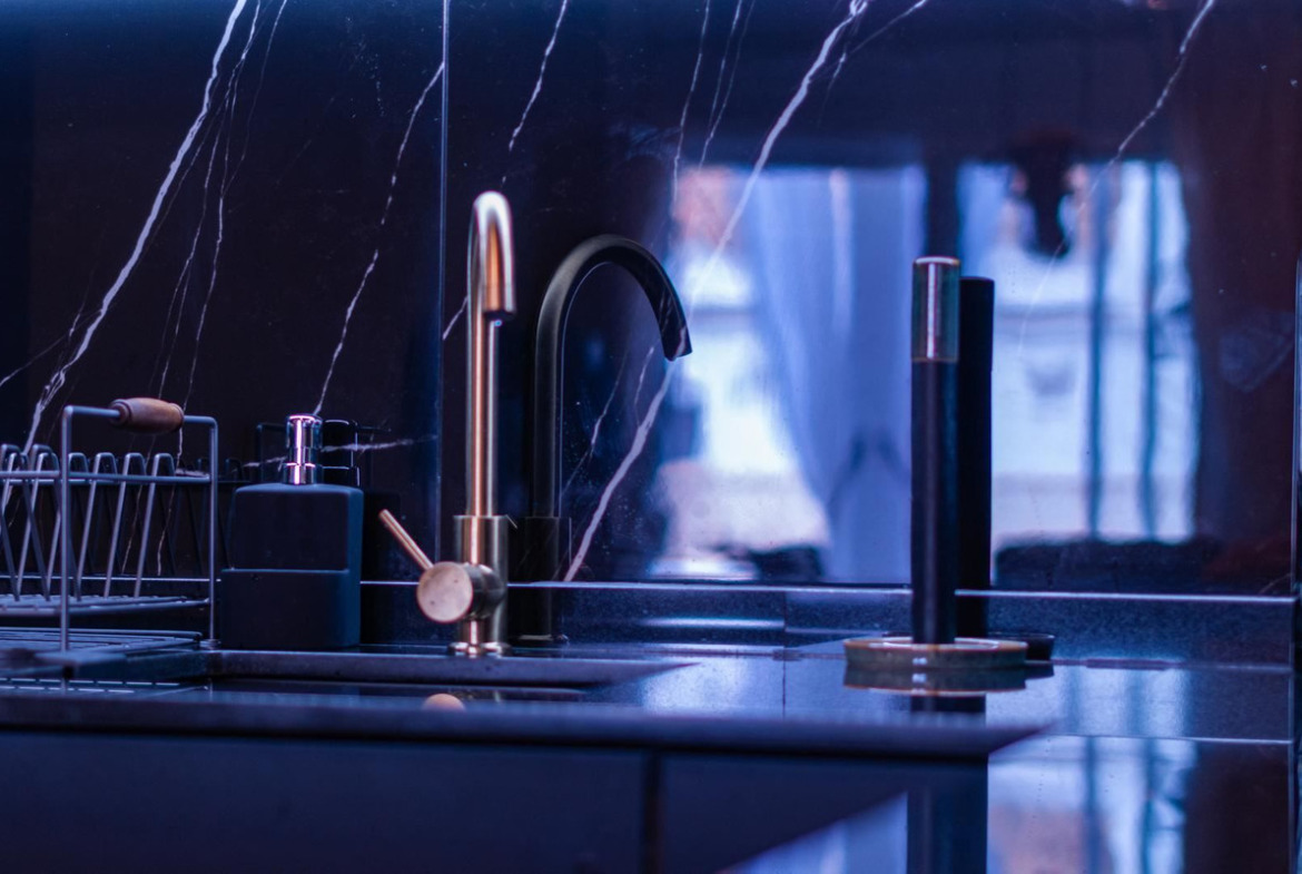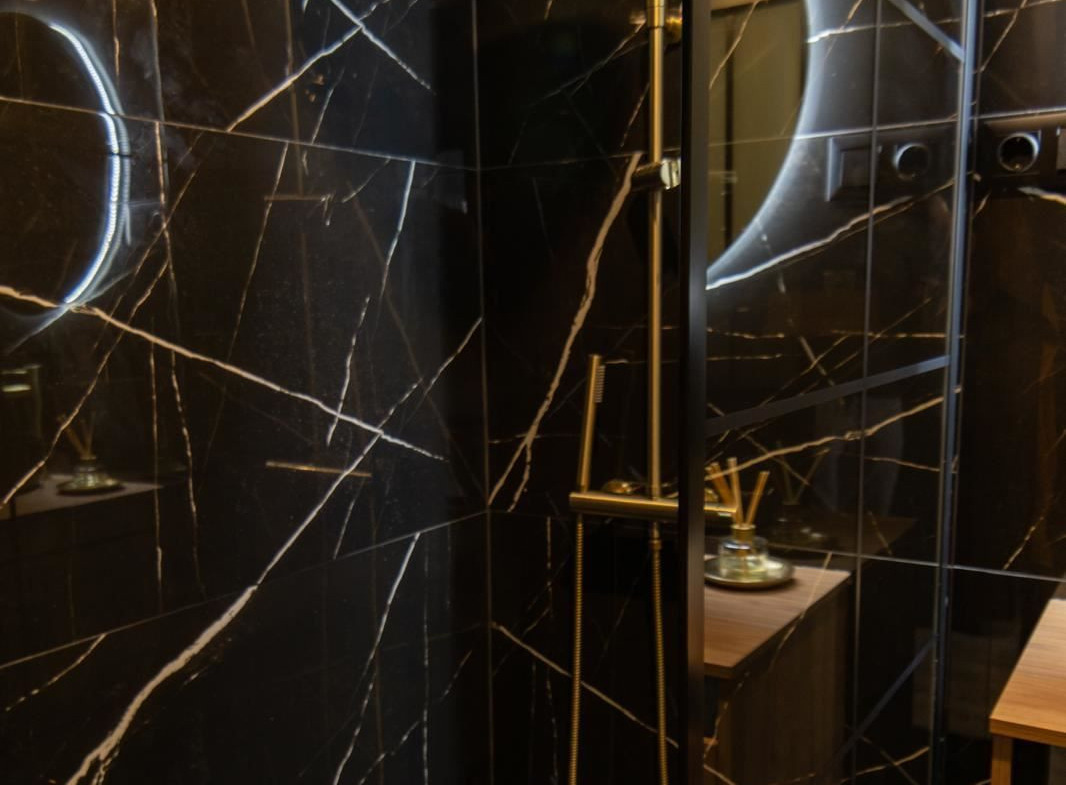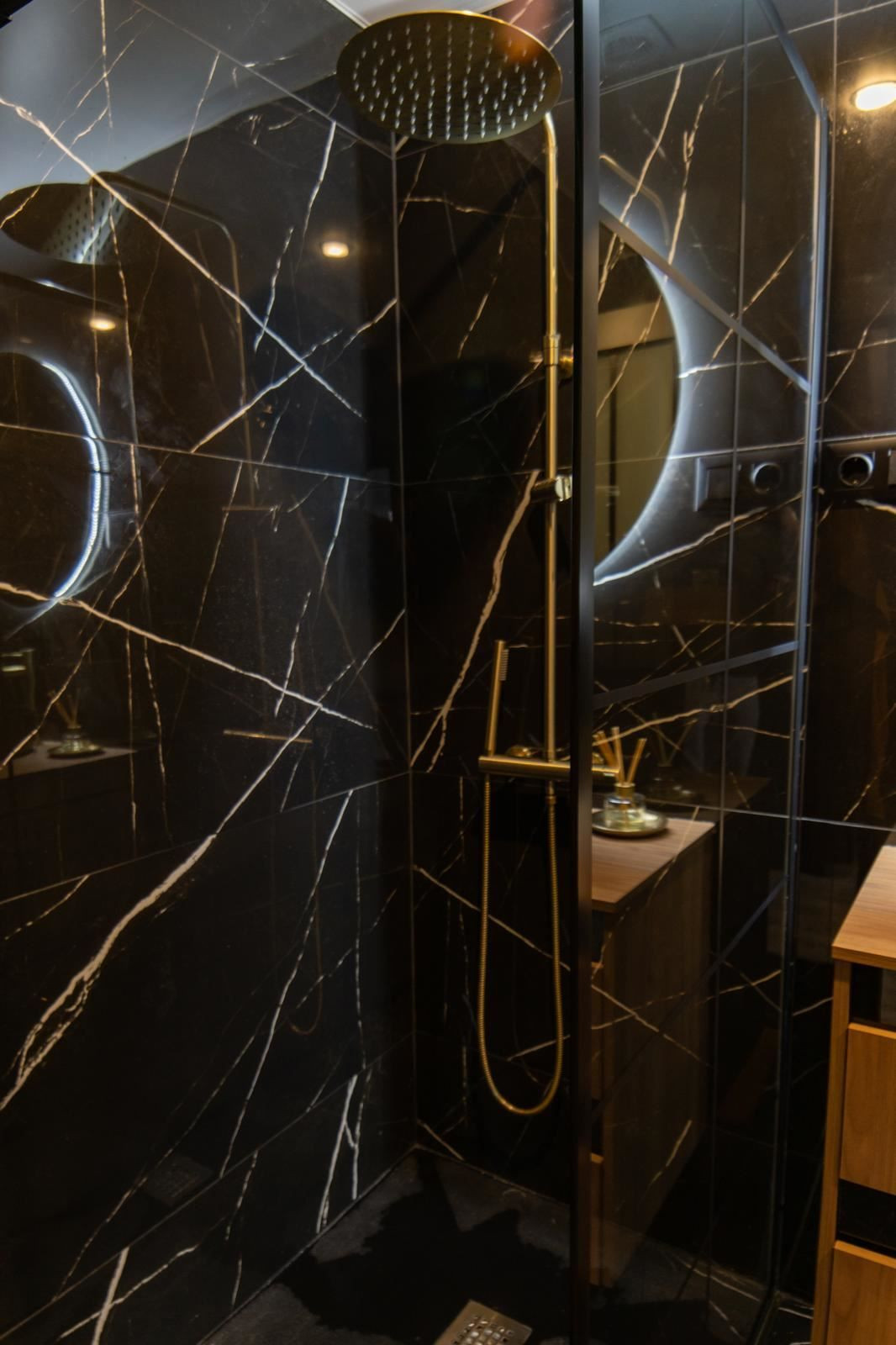 The stylish kitchen is a real highlight. With its elegant design in black marble, it creates an exclusive and modern feel that is perfect for both everyday life and social moments. All appliances and details are well thought out to make the kitchen both beautiful and functional.