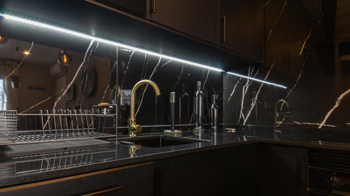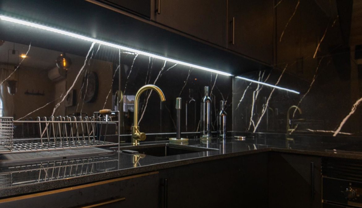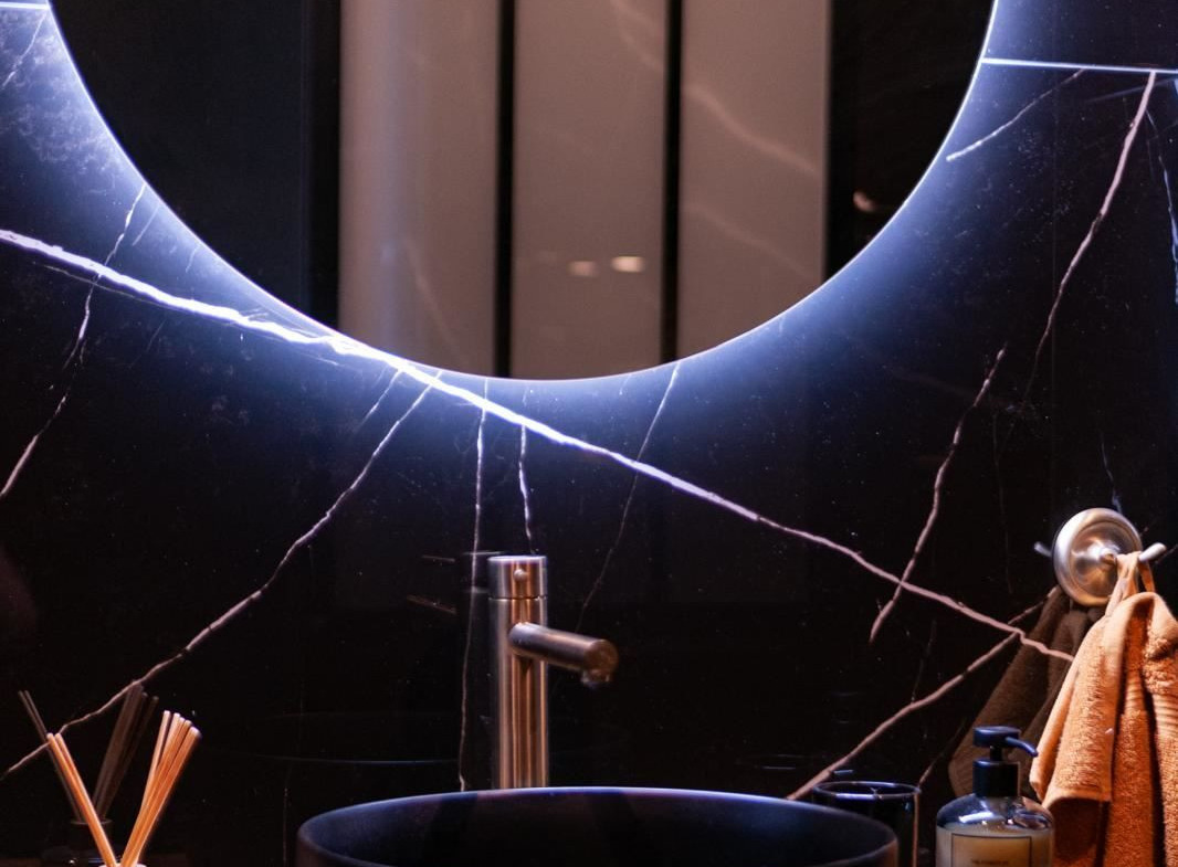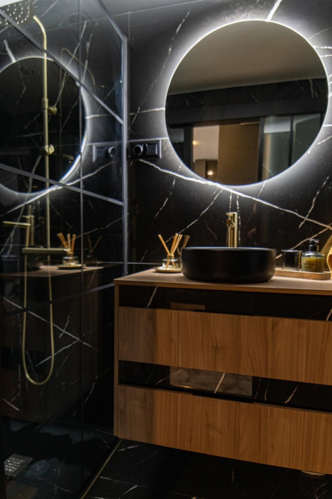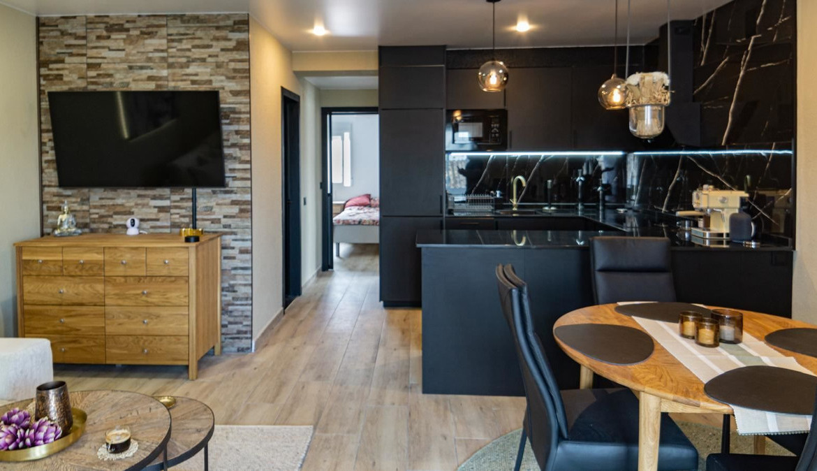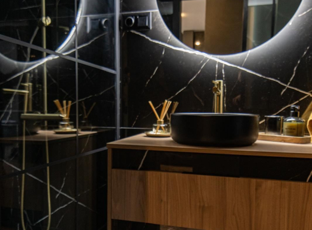 The stylish kitchen is a real highlight. With its elegant design in black marble, it creates an exclusive and modern feel that is perfect for both everyday life and social moments. All appliances and details are well thought out to make the kitchen both beautiful and functional.
