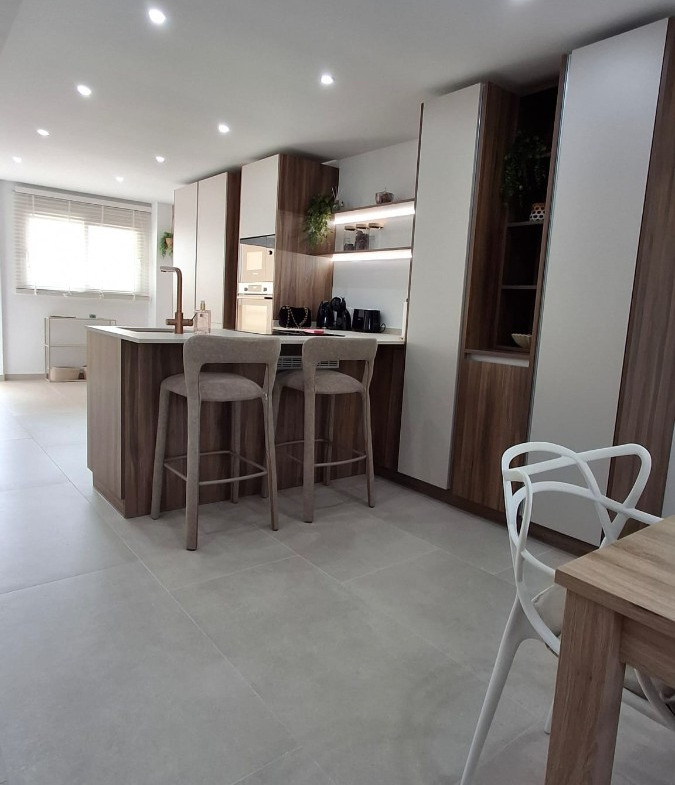 The property has been refurbished using high-quality materials and features a contemporary design with modern tiles, stylish decoration, and an elegant atmosphere that combines comfort and functionality. The living area is connected to an innovative open-plan kitchen with a central island, fully equipped and perfect for everyday living.