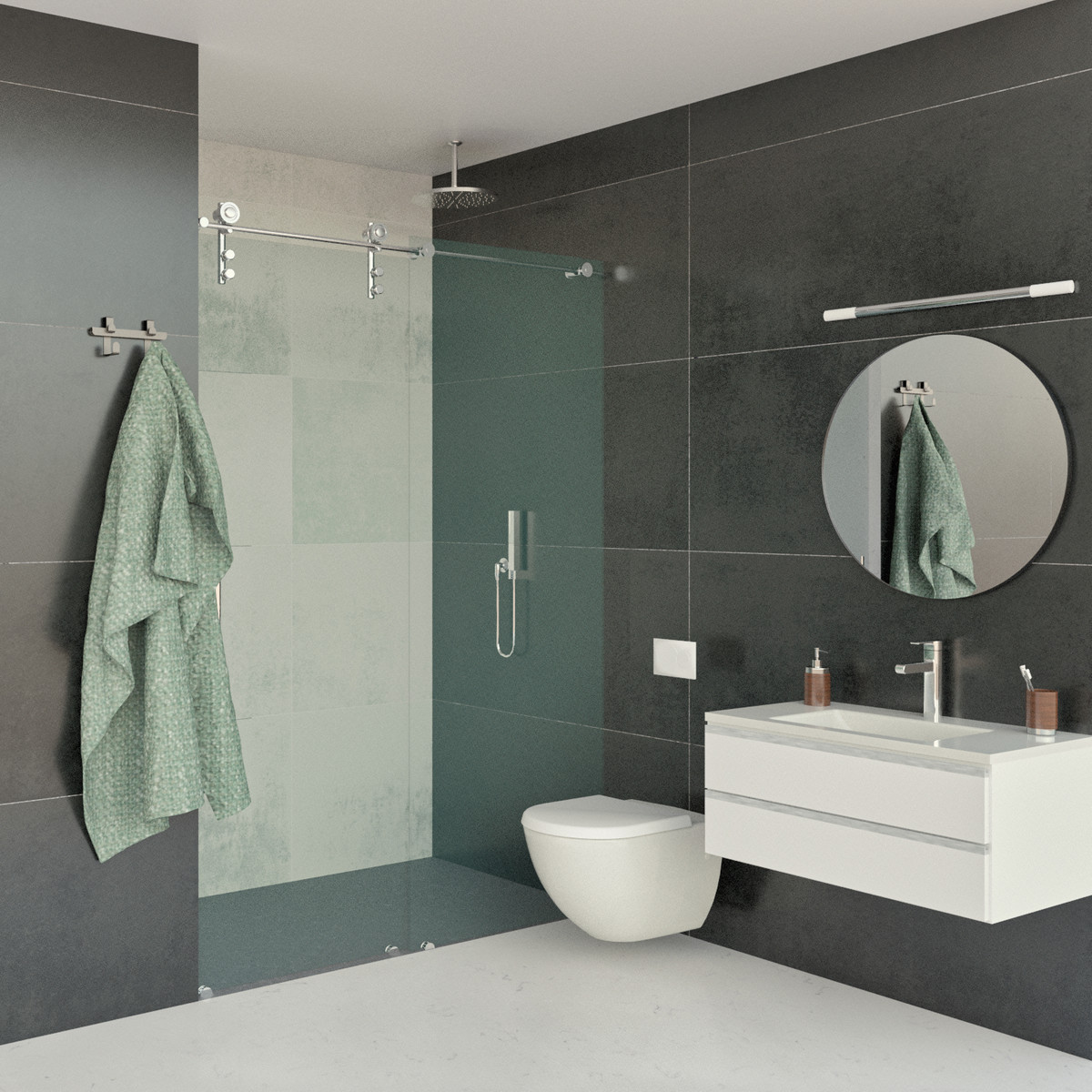Interiors are finished with smooth white paint and porcelain stoneware flooring, while exterior areas boast non-slip ceramic surfaces.