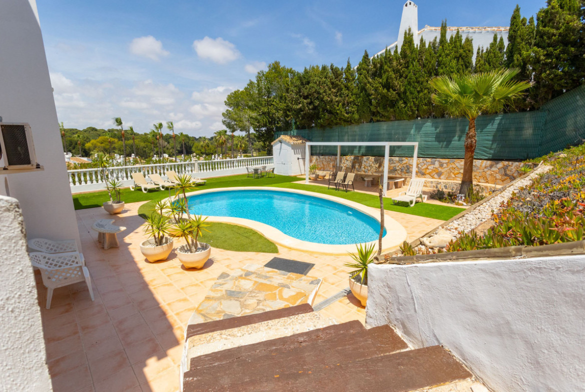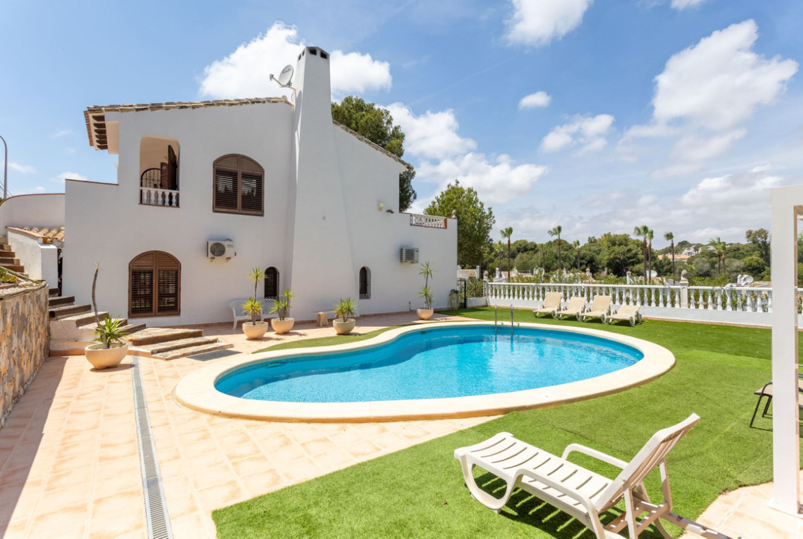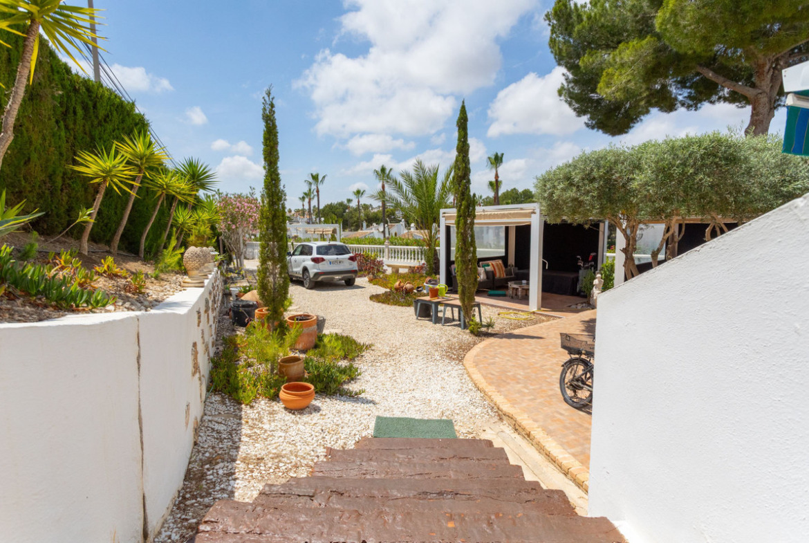 Renovated villa with golf views – an oasis of calm and elegance Welcome to this unique villa overlooking the lush golf course in the heart of Villamartin – a place where the tranquility of nature meets the convenience of a well-established residential area on the Costa Blanca. Located on the charming Calle Manuel de Falla 150, this completely renovated property offers a home where every detail has been carefully thought through, from the floor plan to the choice of materials and garden design.