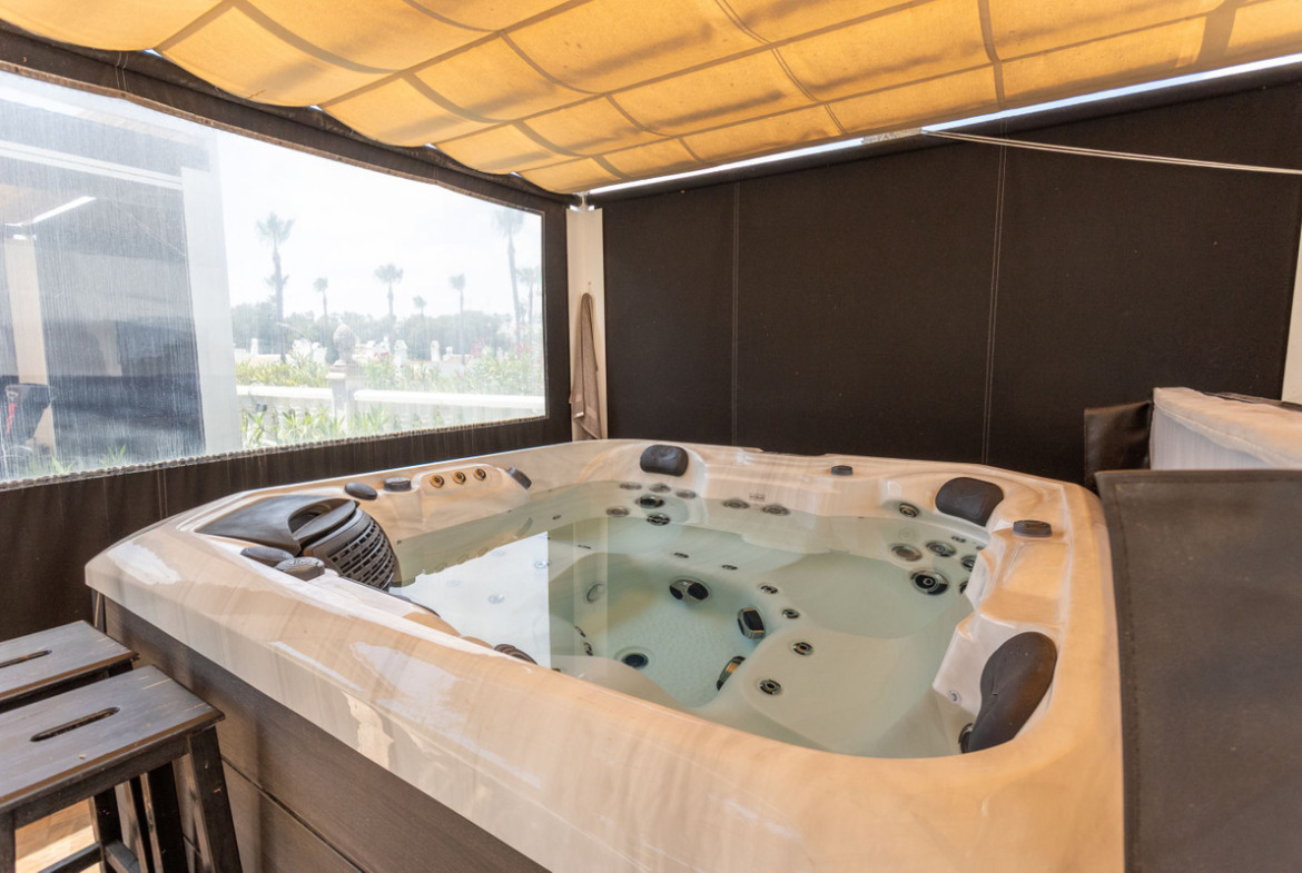 As you step inside, you are greeted by bright, airy rooms where the stylish renovation highlights the original charm of the house. The fully equipped kitchen is open and sociable, with direct access to the patio, blurring the line between inside and outside. The private garden invites you to relax with its large pool, bubbling jacuzzi and several seating areas in both sun and shade – perfect for long dinners under the stars or quiet morning coffee in the shade of the palm trees.