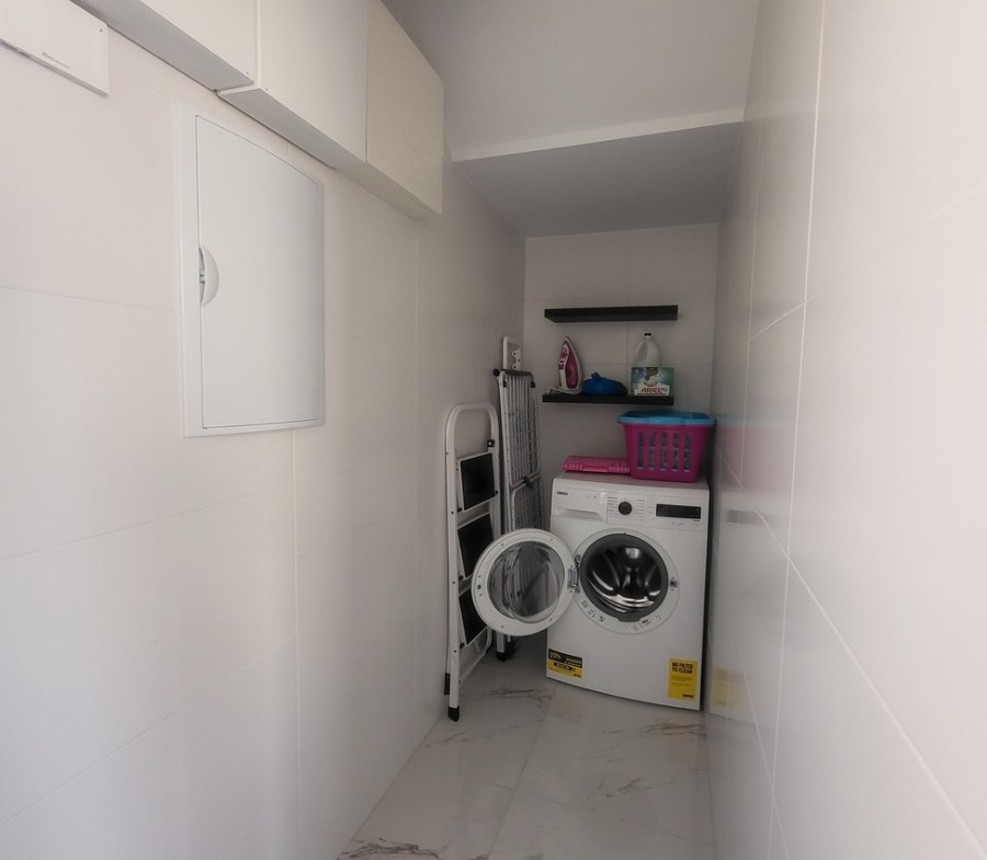 The <strong>fully equipped open-plan kitchen</strong> blends seamlessly into the living space, while a separate <strong>laundry room</strong> provides a practical area for a washing machine.</p>