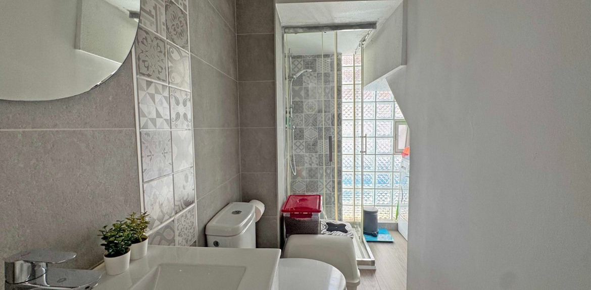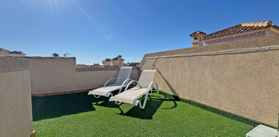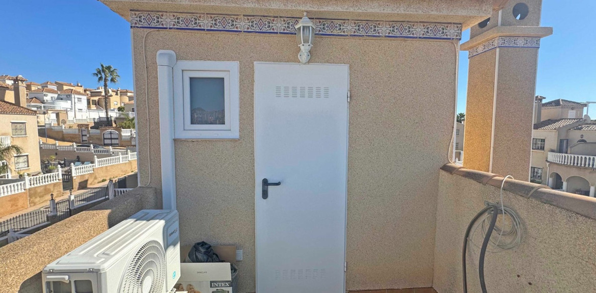 From the landing, stairs lead to the private roof solarium, finished with artificial grass and offering an ideal space for relaxing or entertaining. On this level there is also an additional air-conditioned room, perfect as a third bedroom, home office, or storage space.