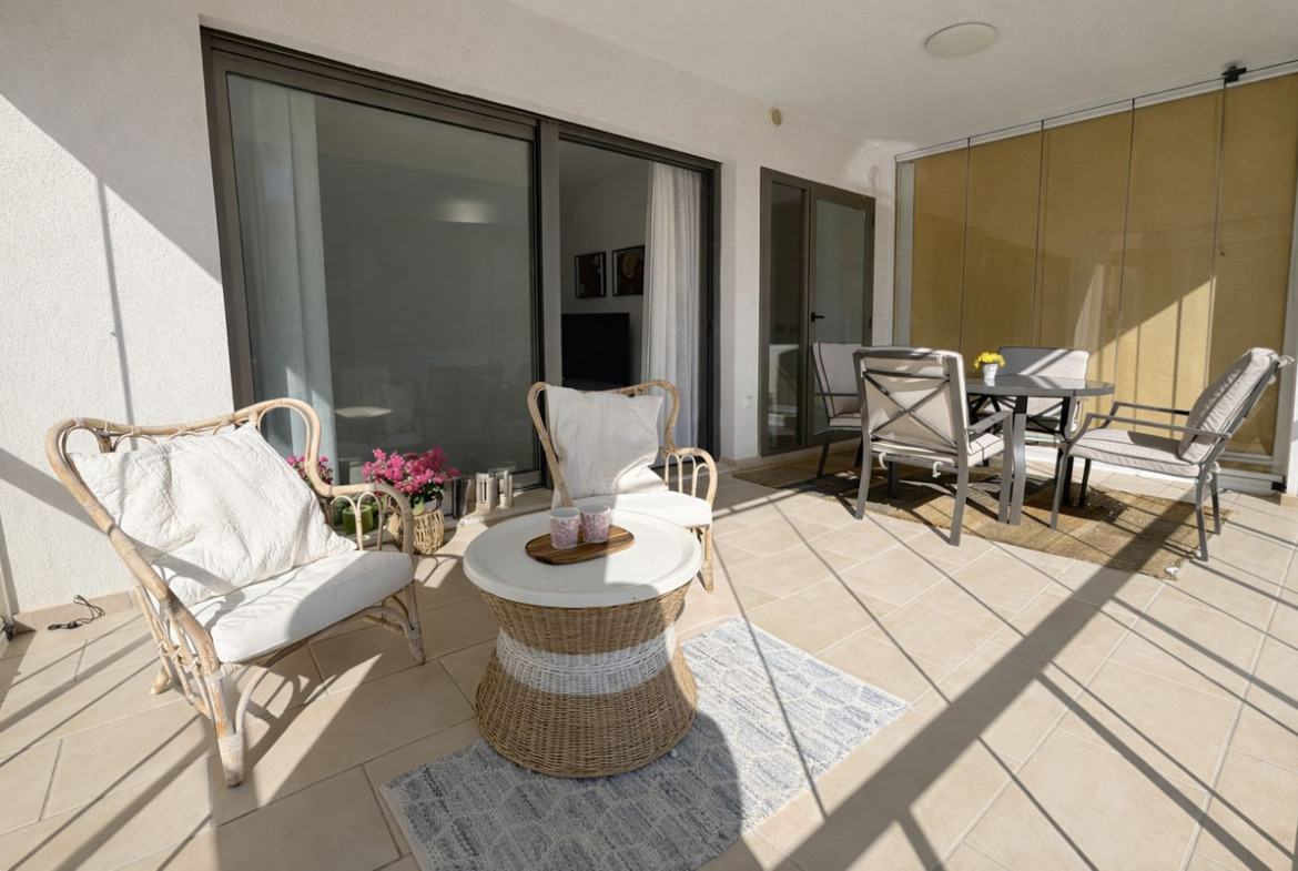 Bright and stylish 2-bedroom, 2-bathroom apartment on the second floor, offering 83 m² of living space and a 20 m² south-facing glazed terrace with views over the pool and gardens — perfect for relaxing, dining, or soaking up the sun.