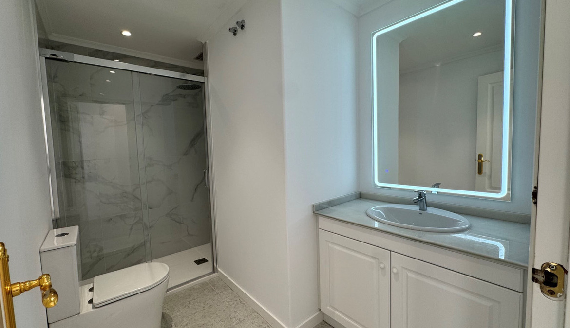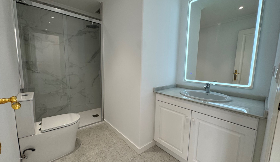 The home offers two spacious bedrooms and two stylishly renovated bathrooms, one of which has a modern walk-in shower. The total built area of 83 m² has been refined with thoughtful material choices such as natural stone, large porcelain tiles and tasteful design details. The kitchen is equipped with an induction hob and luxurious appliances, and the entire home has inverter air conditioning, central gas and an efficient heating system with a double boiler. The soundproofing is very good, which further enhances the peaceful atmosphere.