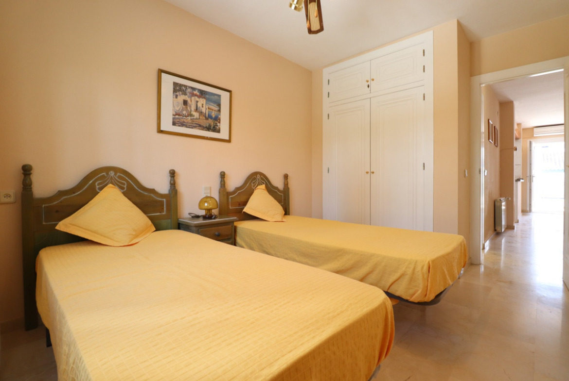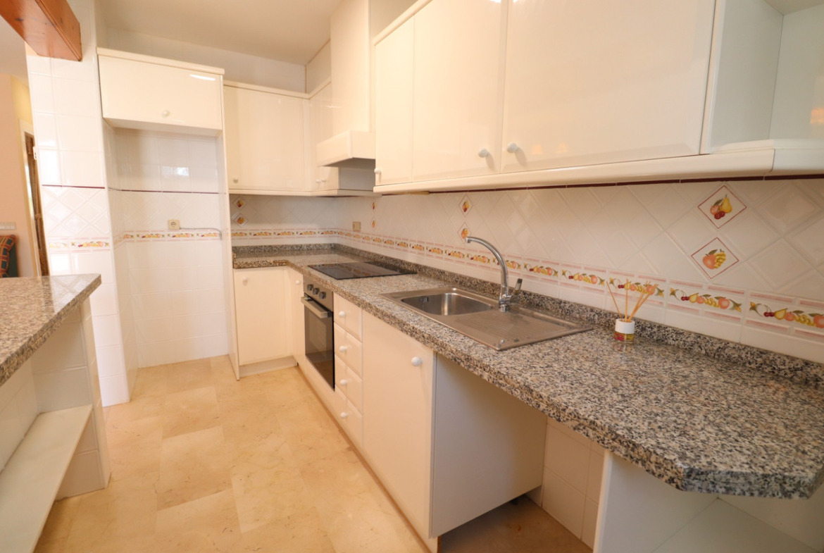 This South East Facing, Two Bedroom, Bungalow in Villamartin is located in a fantastic and highly convenient area on the Costa Blanca South. The La Rioja commercial centre is just a few minutes walk away, with a main chain supermarket within 10 minutes. Villamartin Golf Course and the popular “plaza” can be reached in around 15 minutes, while La Zenia Boulevard shopping centre is only a 5 minute drive and the beautiful beaches of the coast just 10 minutes away. The property benefits from both front and rear gardens and offers a comfortable lounge/dining room with a charming brick open fireplace. There is an open plan fitted kitchen with a breakfast bar, two double bedrooms with built-in wardrobes, and a family bathroom. The master bedroom features double sliding glazed doors leading out to a private pebbled garden, overlooking a lovely communal green area. To the front, there is a pebbled garden and an entrance terrace, from which there is access to a private solarium — perfect for enjoying the sun all day long. The property also enjoys access to an attractive and well-maintained communal pool area. A well-located and appealing bungalow, ideal for holidays, rental investment or permanent living in the heart of the Costa Blanca South.
