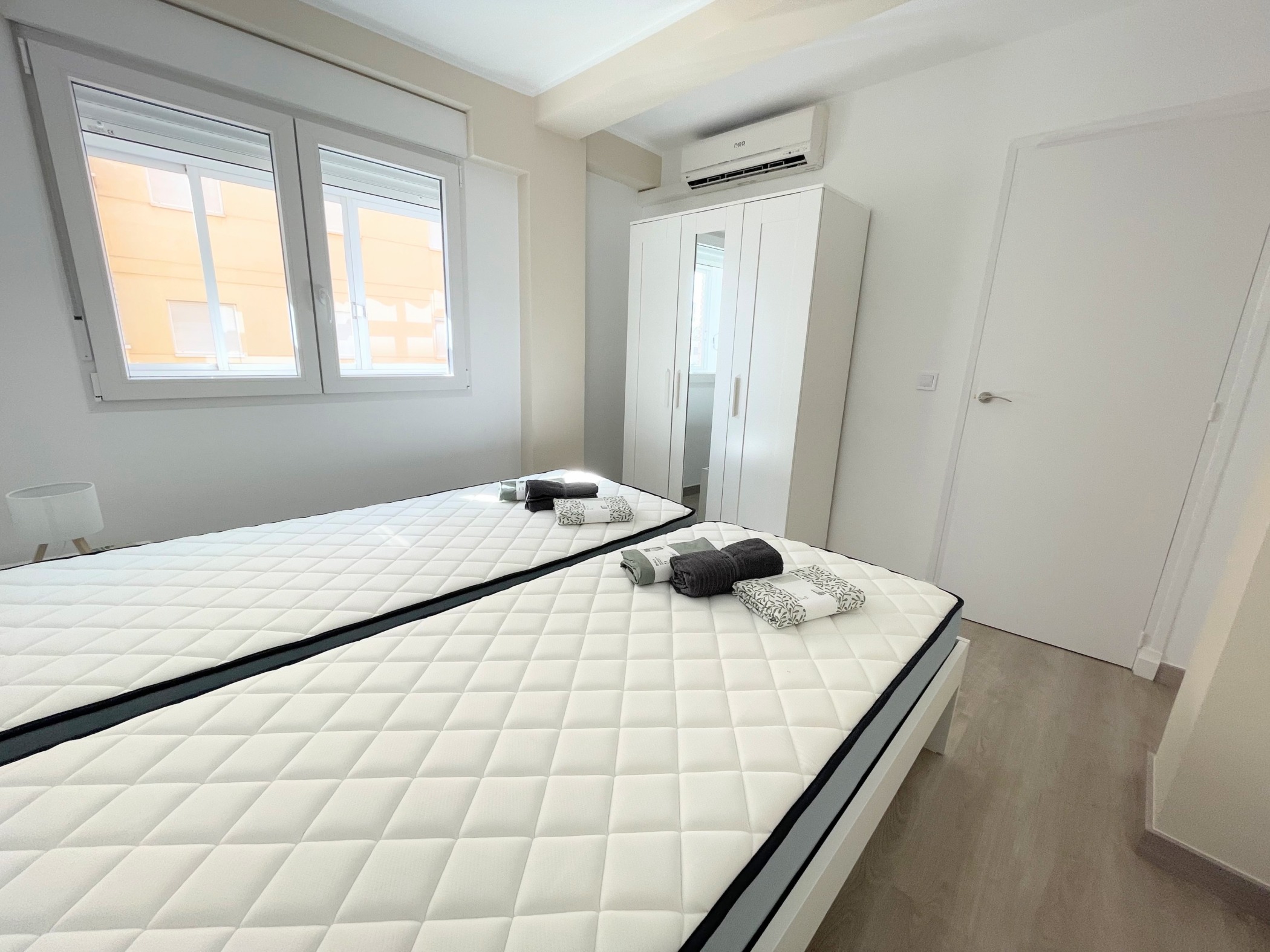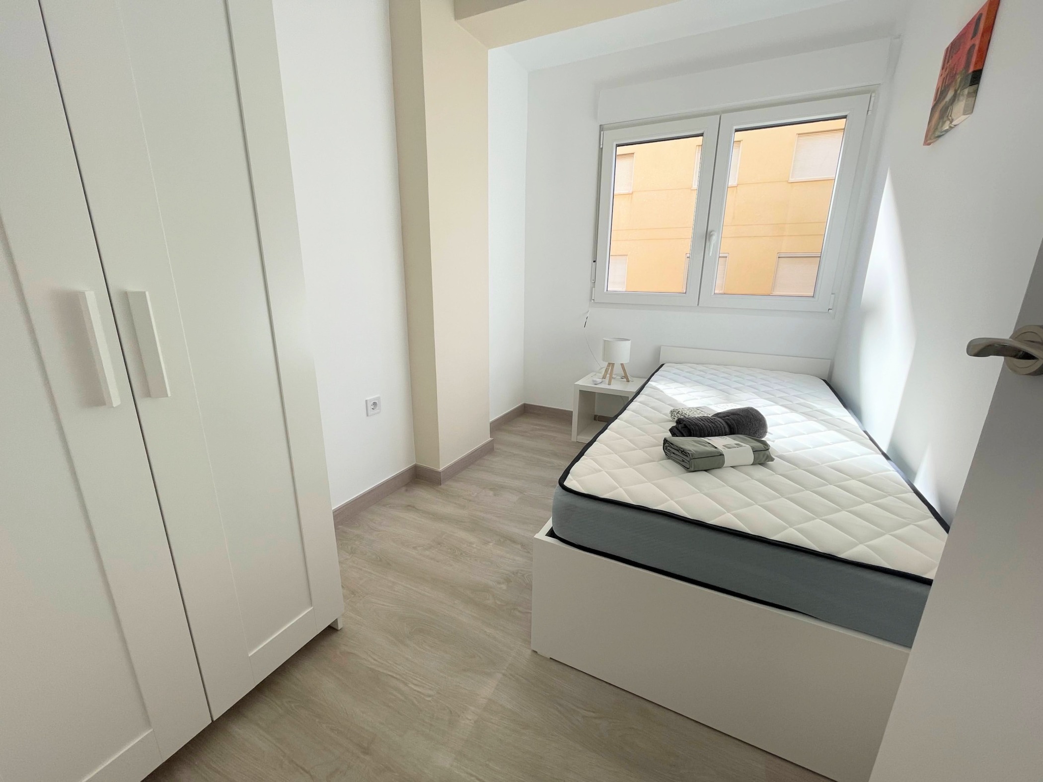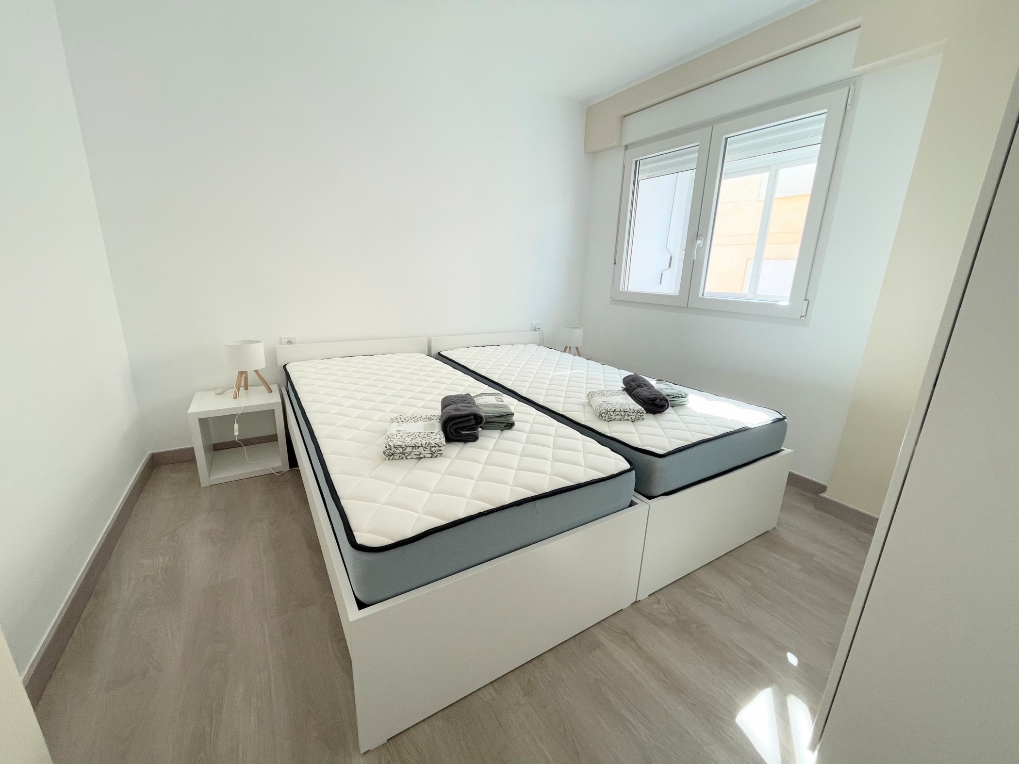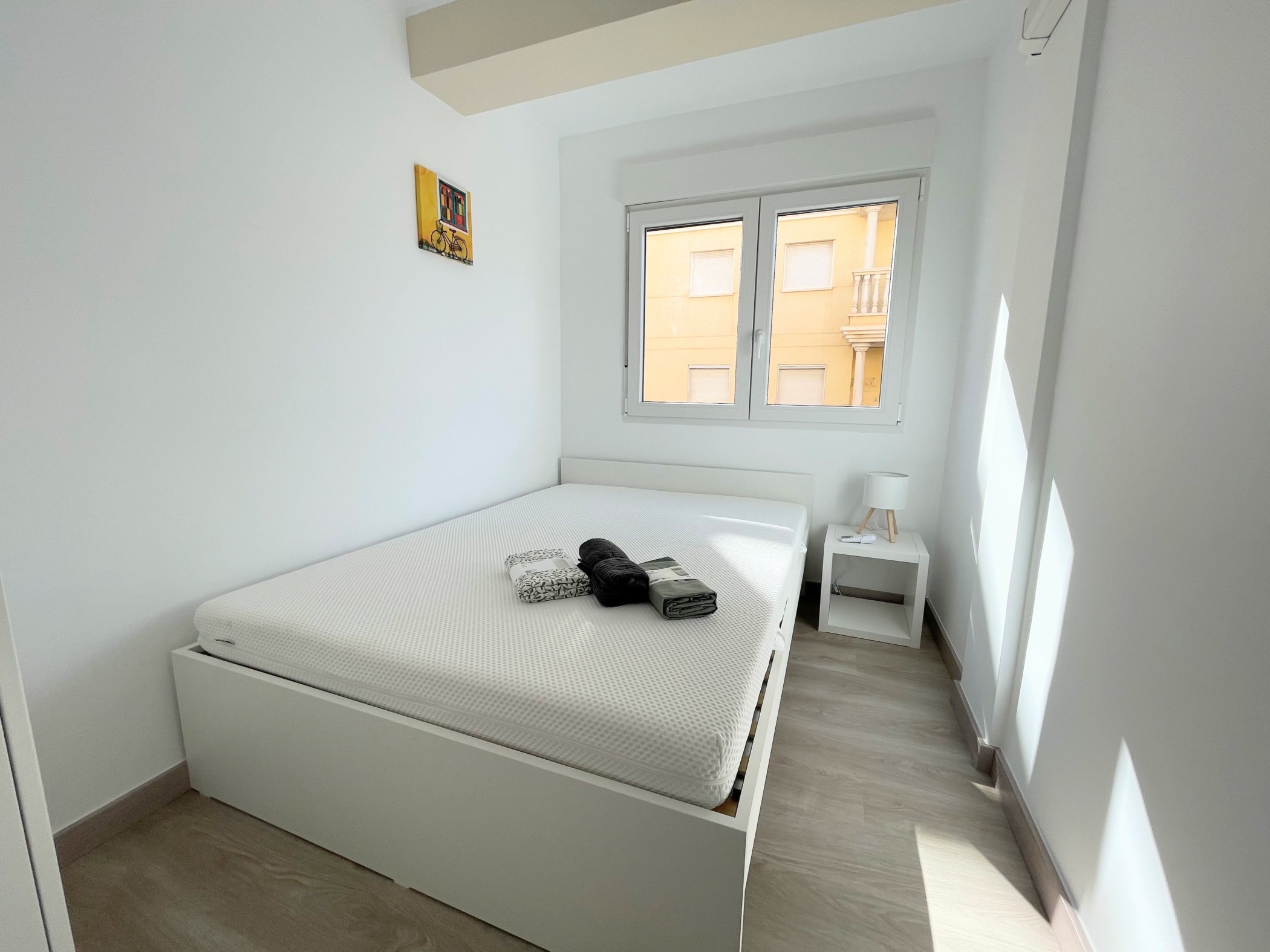 Az ingatlan egy hagyományos spanyol városi stílusban épült, jól karbantartott, liftes társasház 4. emeletén található. Az elrendezés praktikus és családok számára is ideális: tágas nappali + 3 külön hálószoba (kettő franciaággyal, egy pedig egyszemélyes ággyal), különálló konyha, fürdőszoba és egy napfényes terasz. Az apartman világos és barátságos, minden rendelkezésre áll – ide csak be kell költözni.