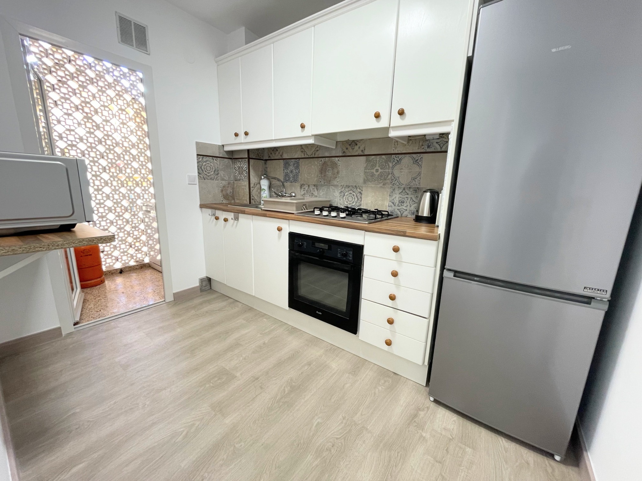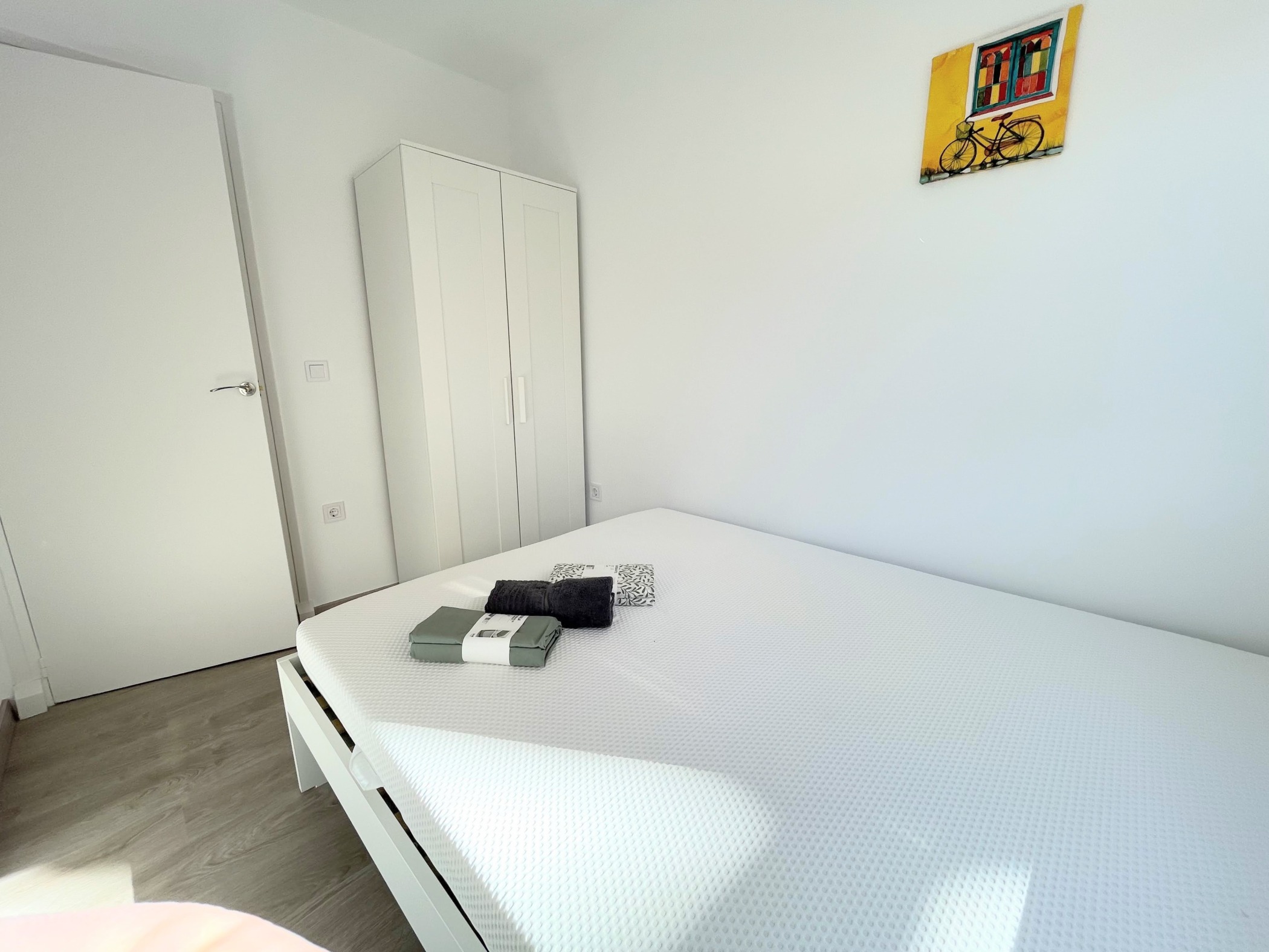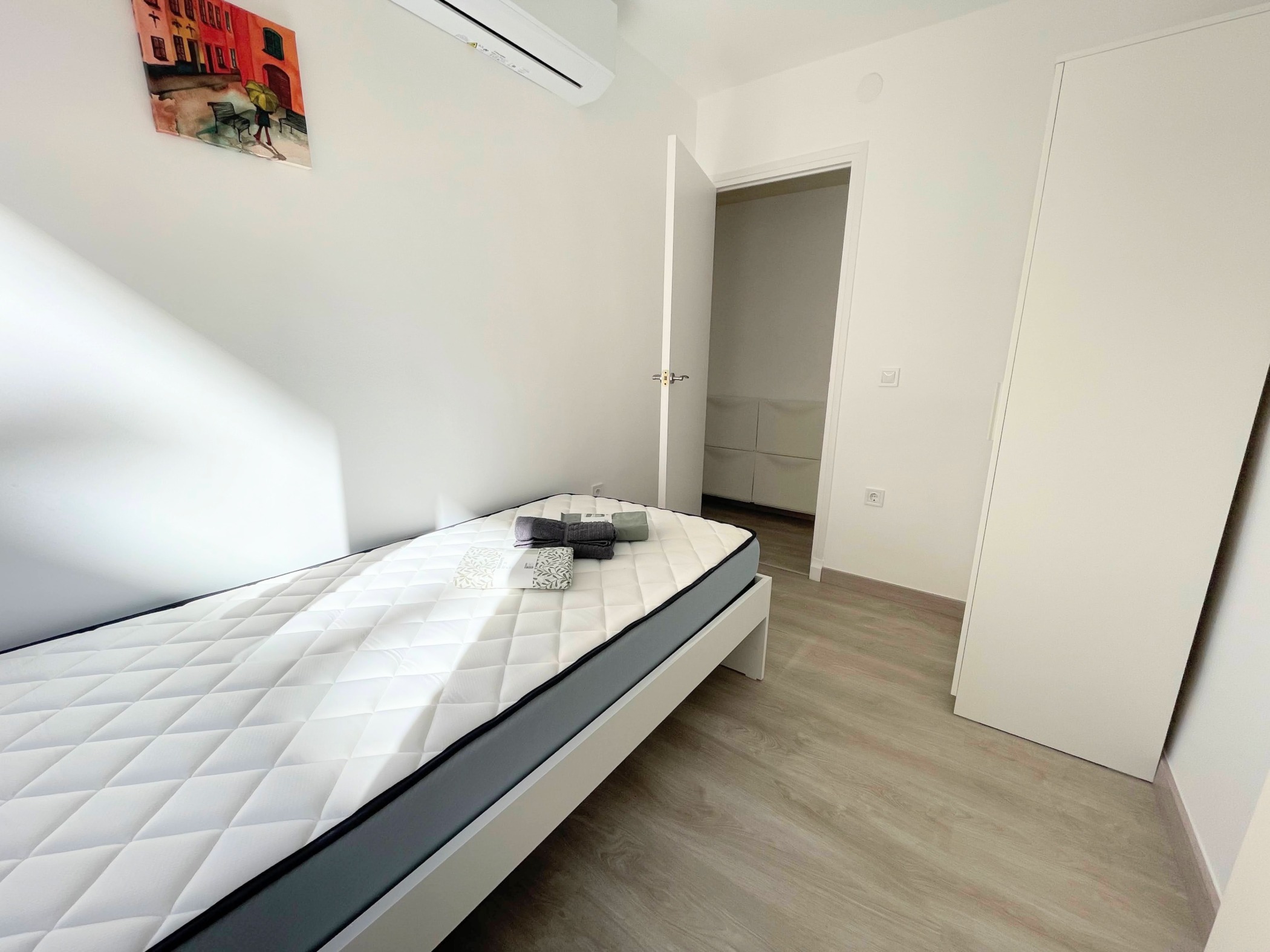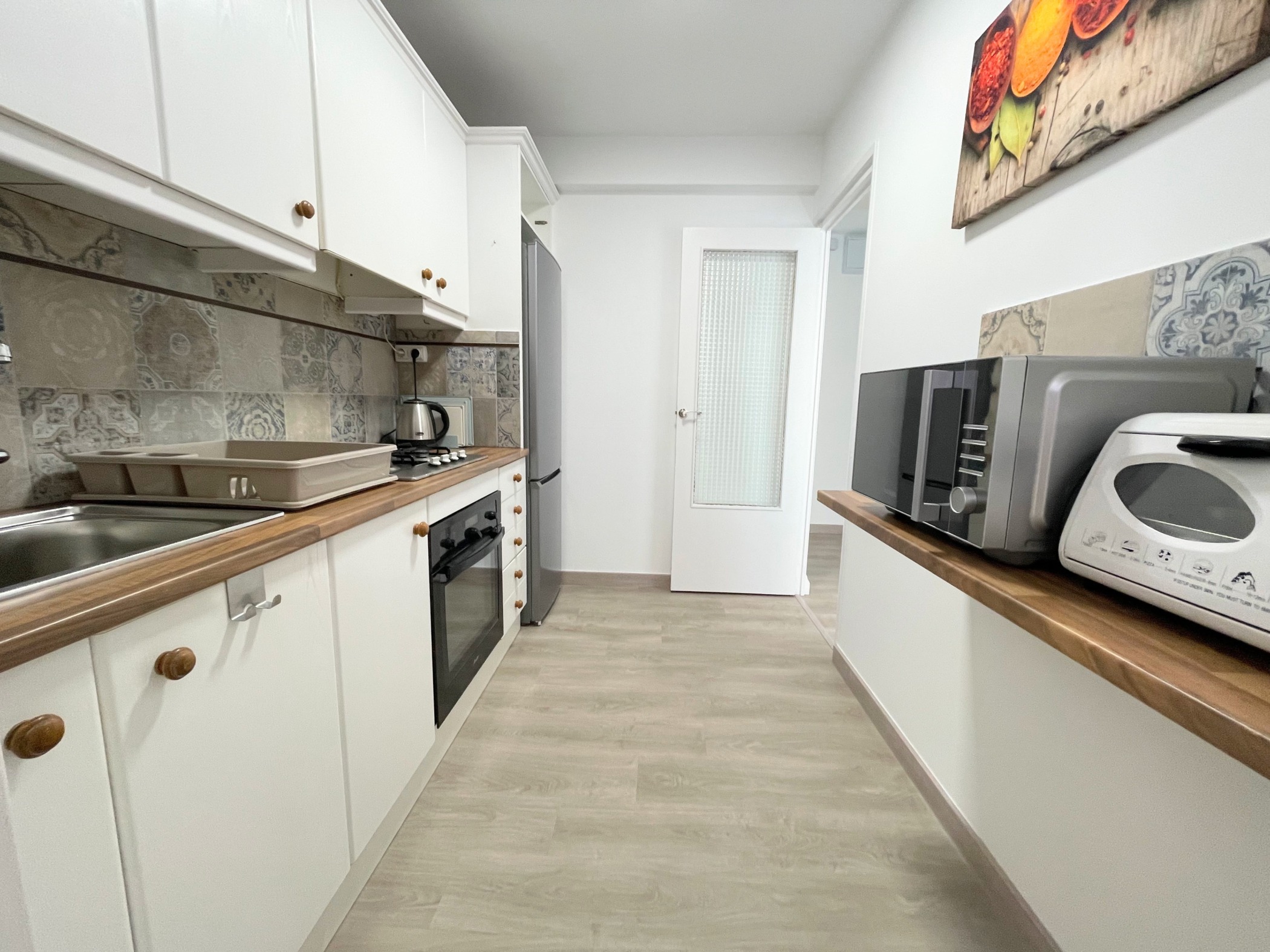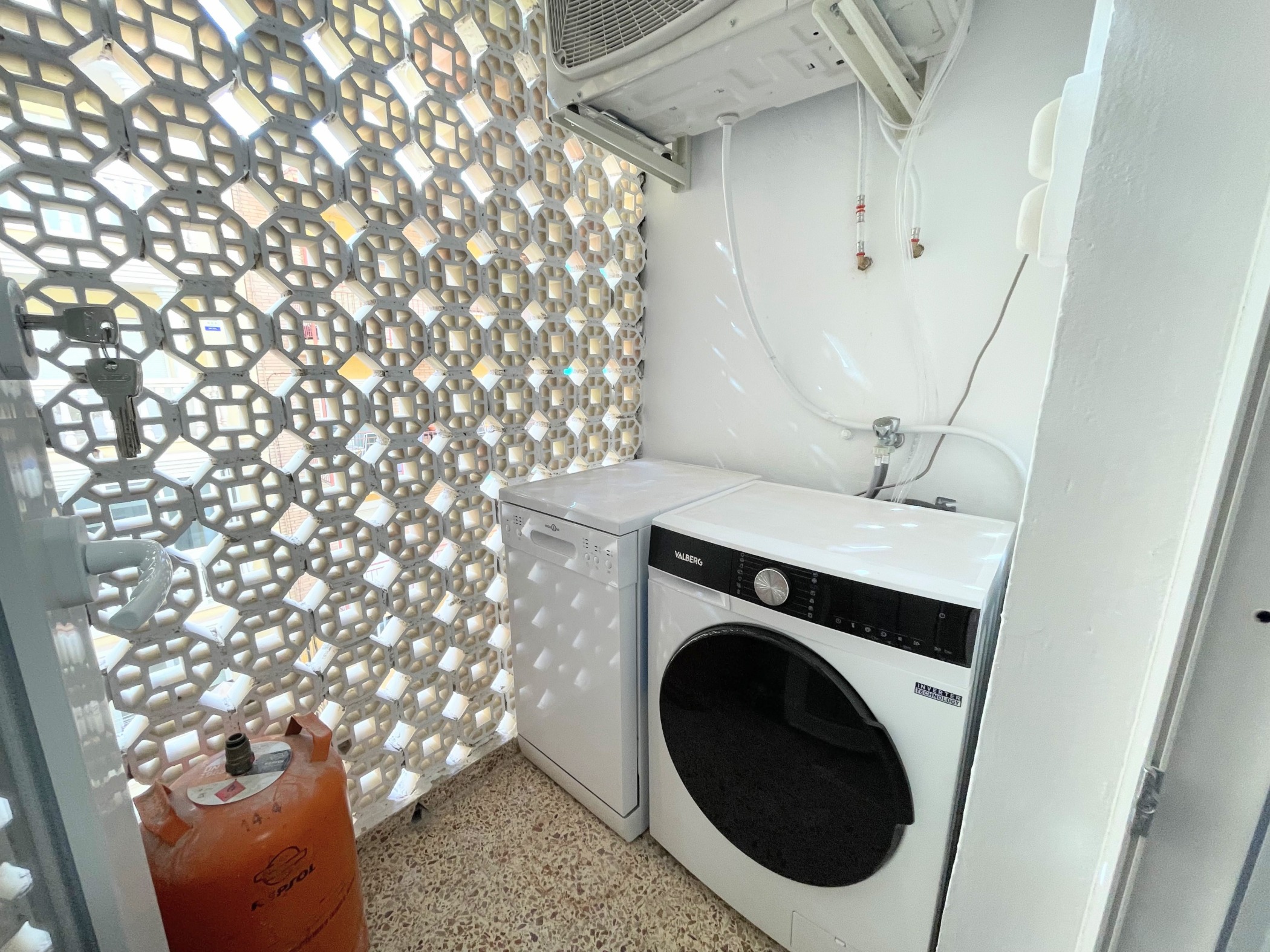 Az ingatlan egy hagyományos spanyol városi stílusban épült, jól karbantartott, liftes társasház 4. emeletén található. Az elrendezés praktikus és családok számára is ideális: tágas nappali + 3 külön hálószoba (kettő franciaággyal, egy pedig egyszemélyes ággyal), különálló konyha, fürdőszoba és egy napfényes terasz. Az apartman világos és barátságos, minden rendelkezésre áll – ide csak be kell költözni.